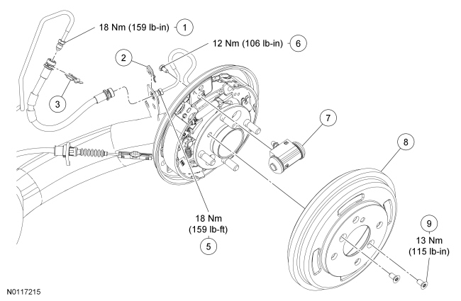 NOTE: If removing the the drum brake backing plate, the wheel hub and bearing must be removed. For additional information, refer to Rear Suspension Service and Repair.