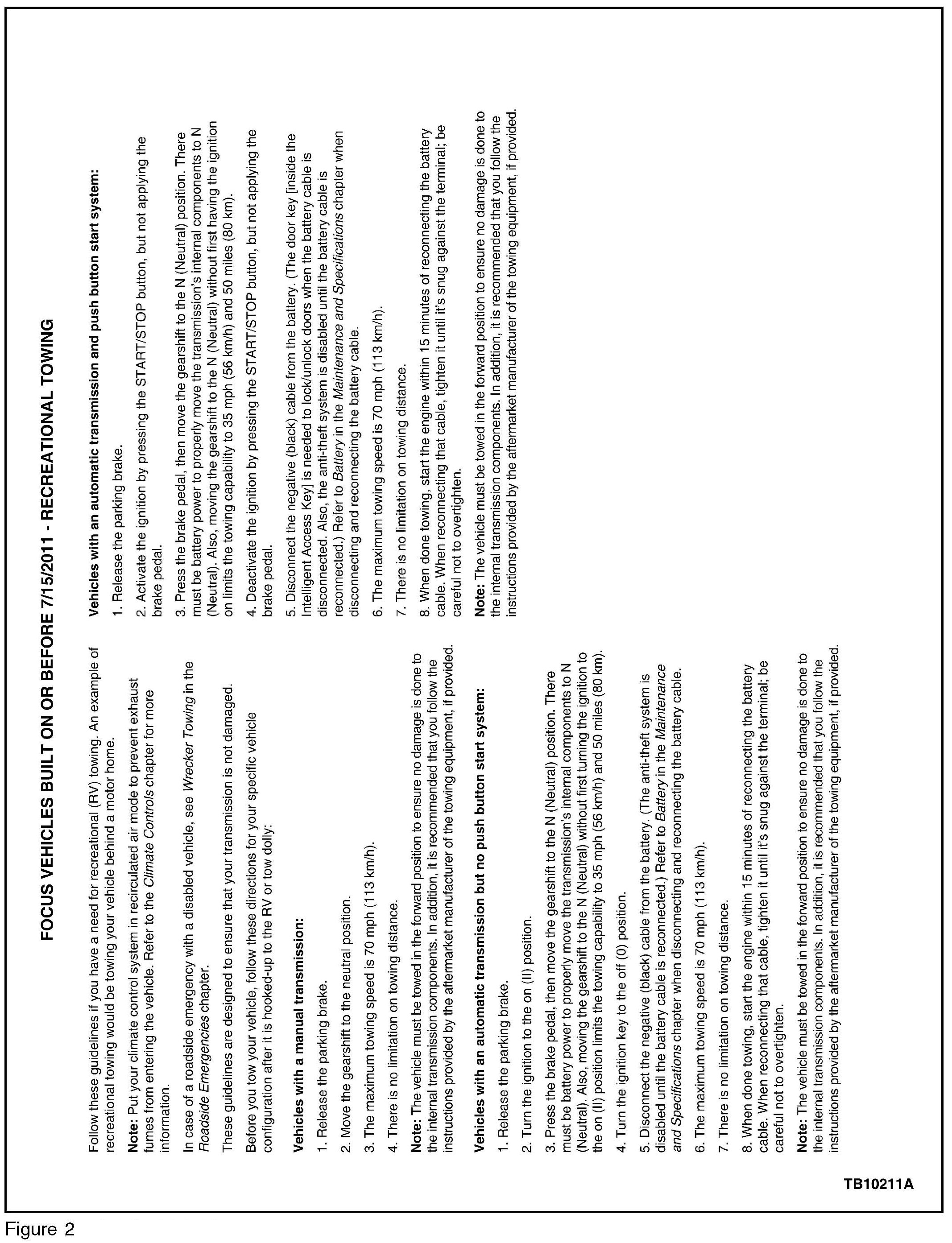 Some 2011 Fiesta and 2012 Focus vehicles built on or before 7/15/2011 and equipped with an automatic transmission may experience transmission concerns if the vehicle is towed with all four (4) wheels on the ground or flat towing.