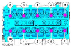 Stage 1: Tighten the bolts evenly, half a turn at a time, until the camshaft bearing caps and the VCT (Variable Camshaft Timing) bridge are seated against the cylinder head.
