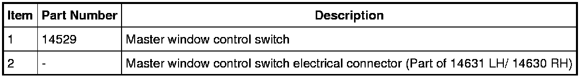 - The master window control switch and the LH window motor must be initialized whenever battery voltage has been removed from the driver window control switch for greater than 3 minutes (for example, the battery or the master window switch is disconnected) or if a new driver window control switch is installed. For additional information, refer to Window Motor Initialization Programming and Relearning.