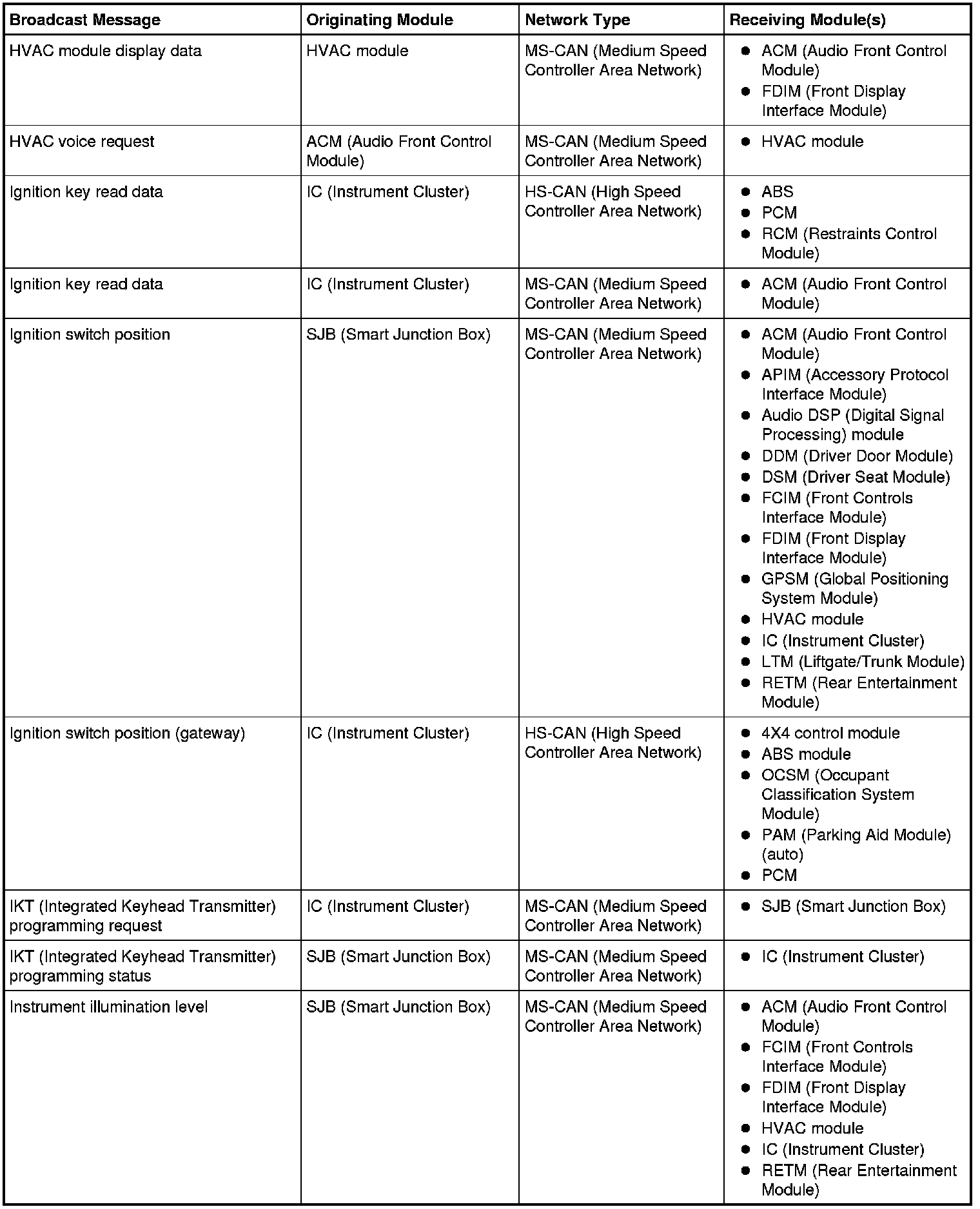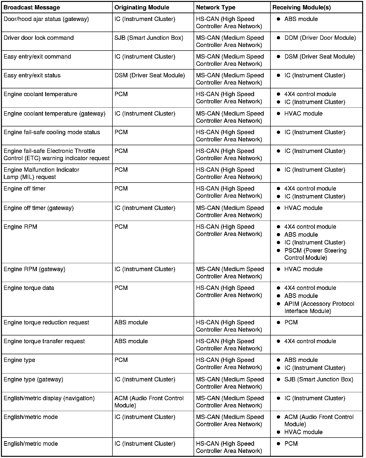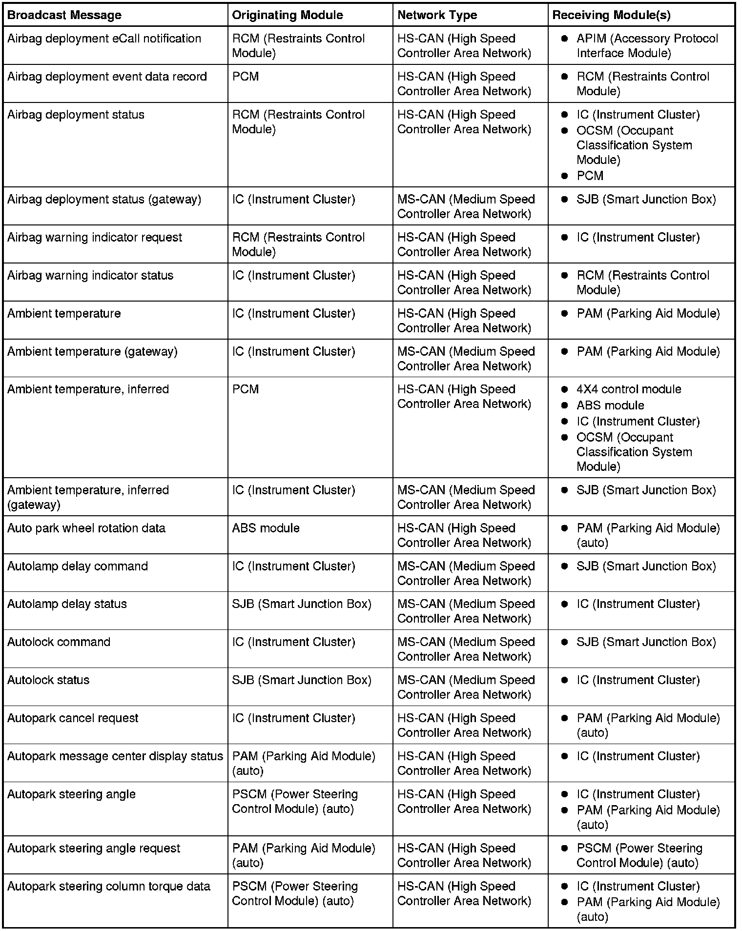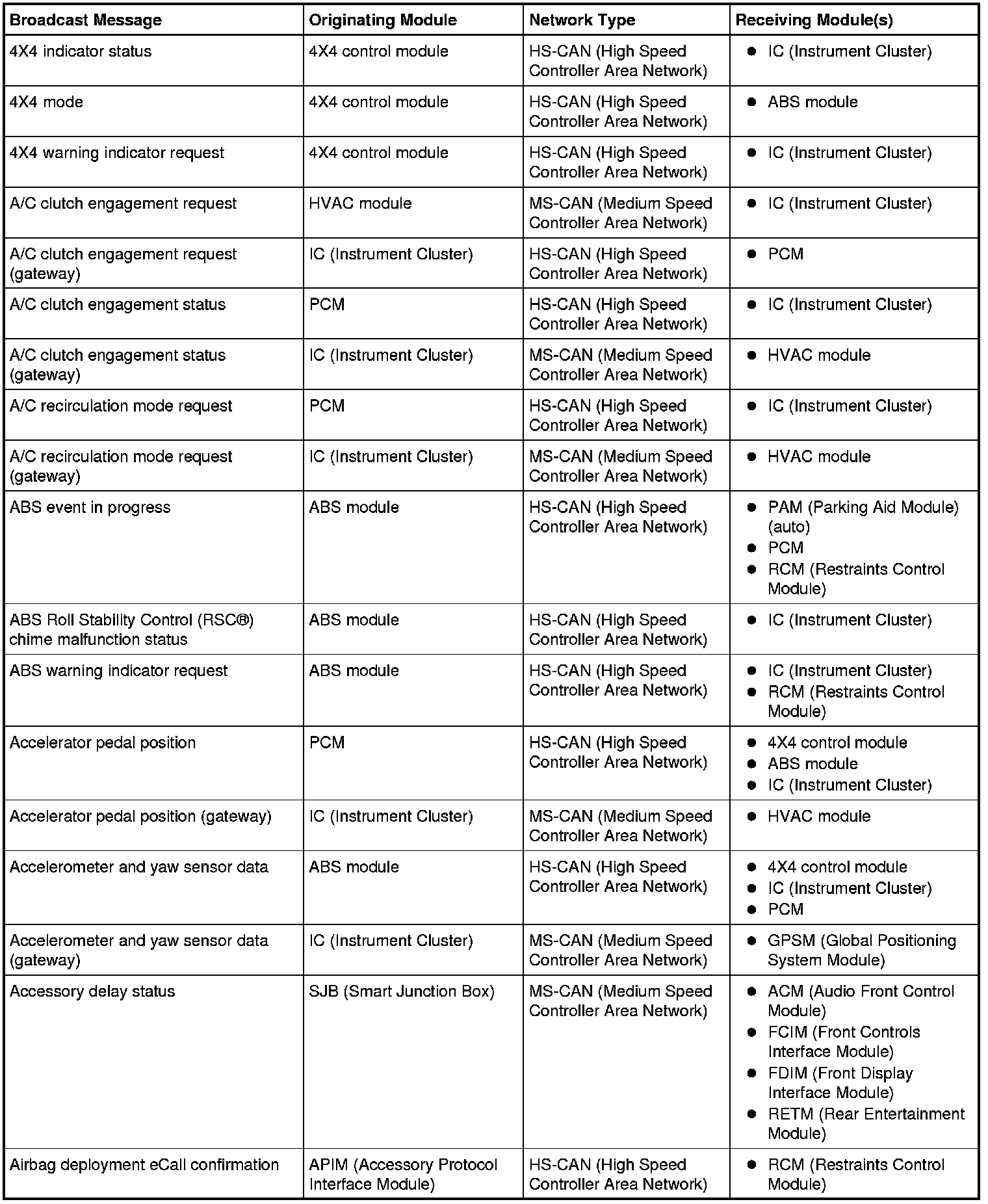 NOTE: This chart describes the specific HS-CAN (High Speed Controller Area Network) and MS-CAN (Medium Speed Controller Area Network) messages broadcast by each module, and the module(s) that receive the message.