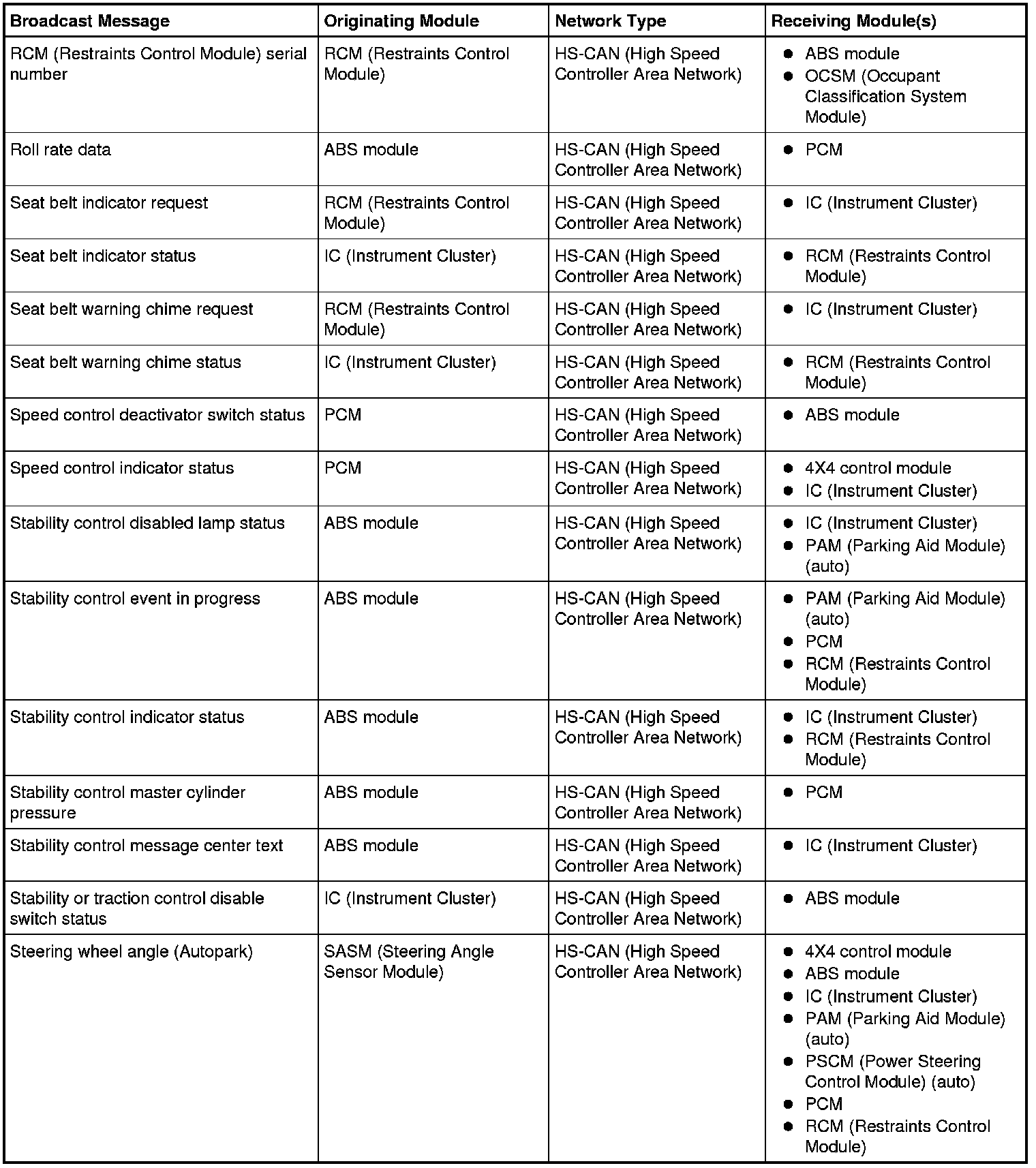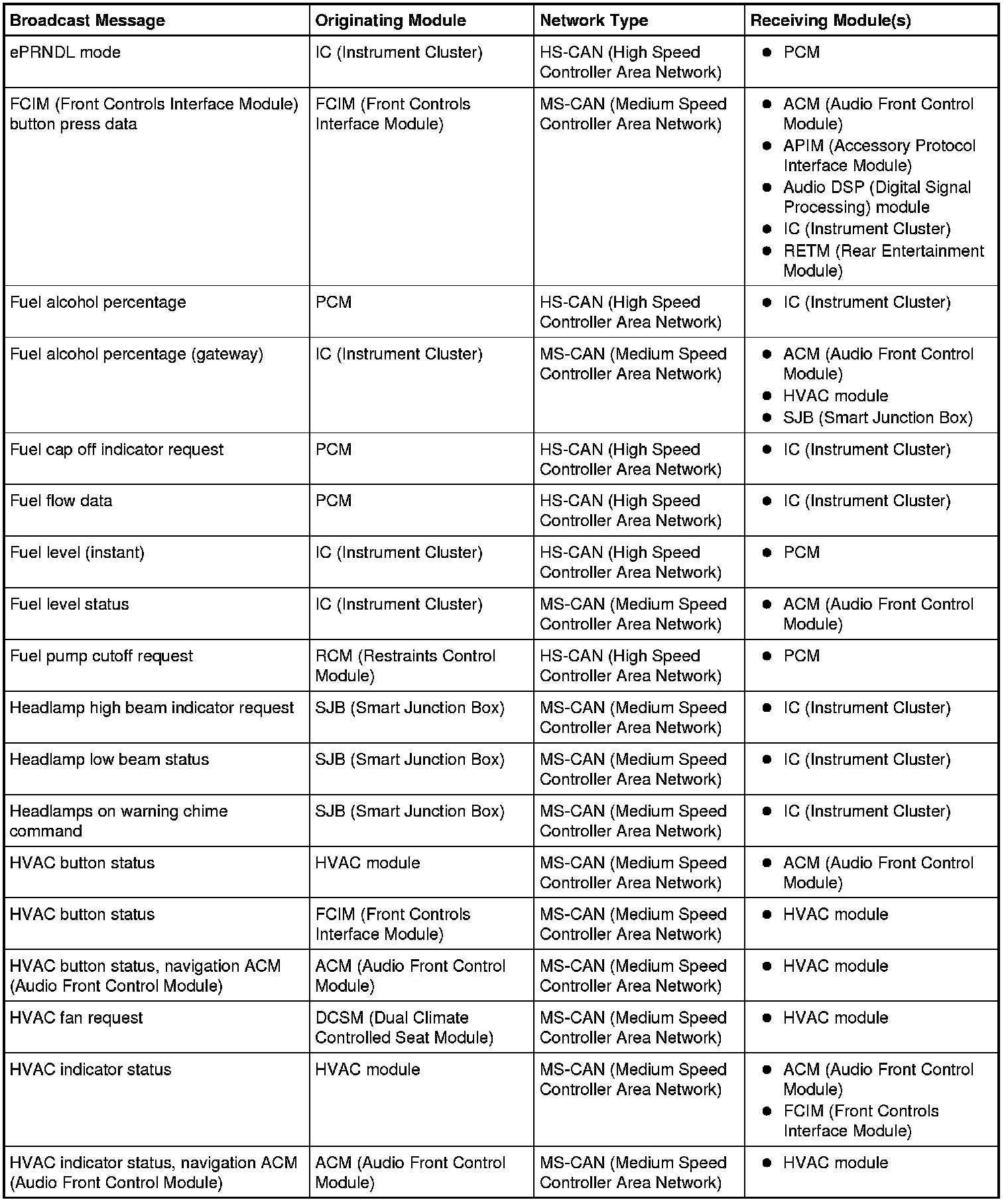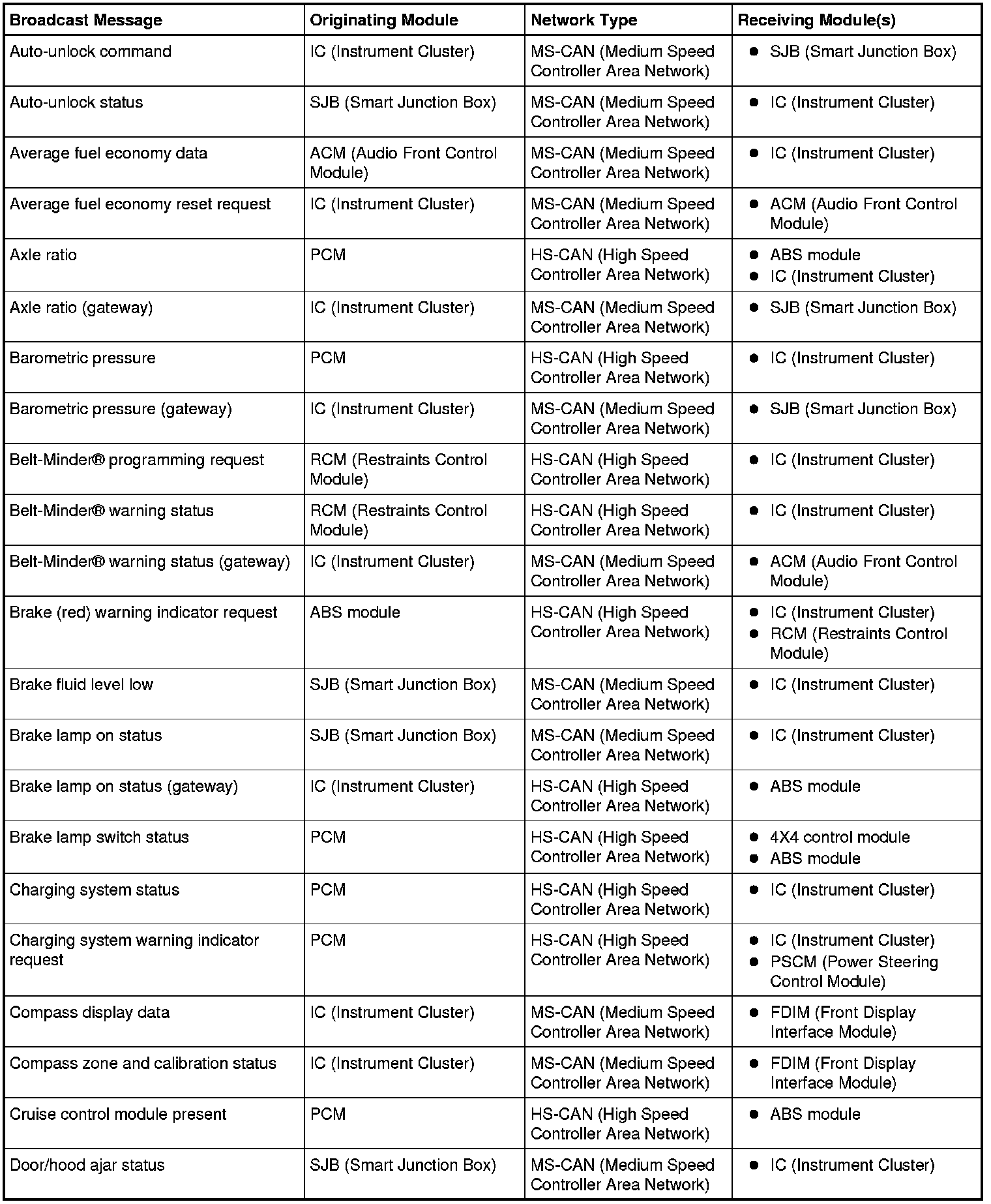 NOTE: This chart describes the specific HS-CAN (High Speed Controller Area Network) and MS-CAN (Medium Speed Controller Area Network) messages broadcast by each module, and the module(s) that receive the message.