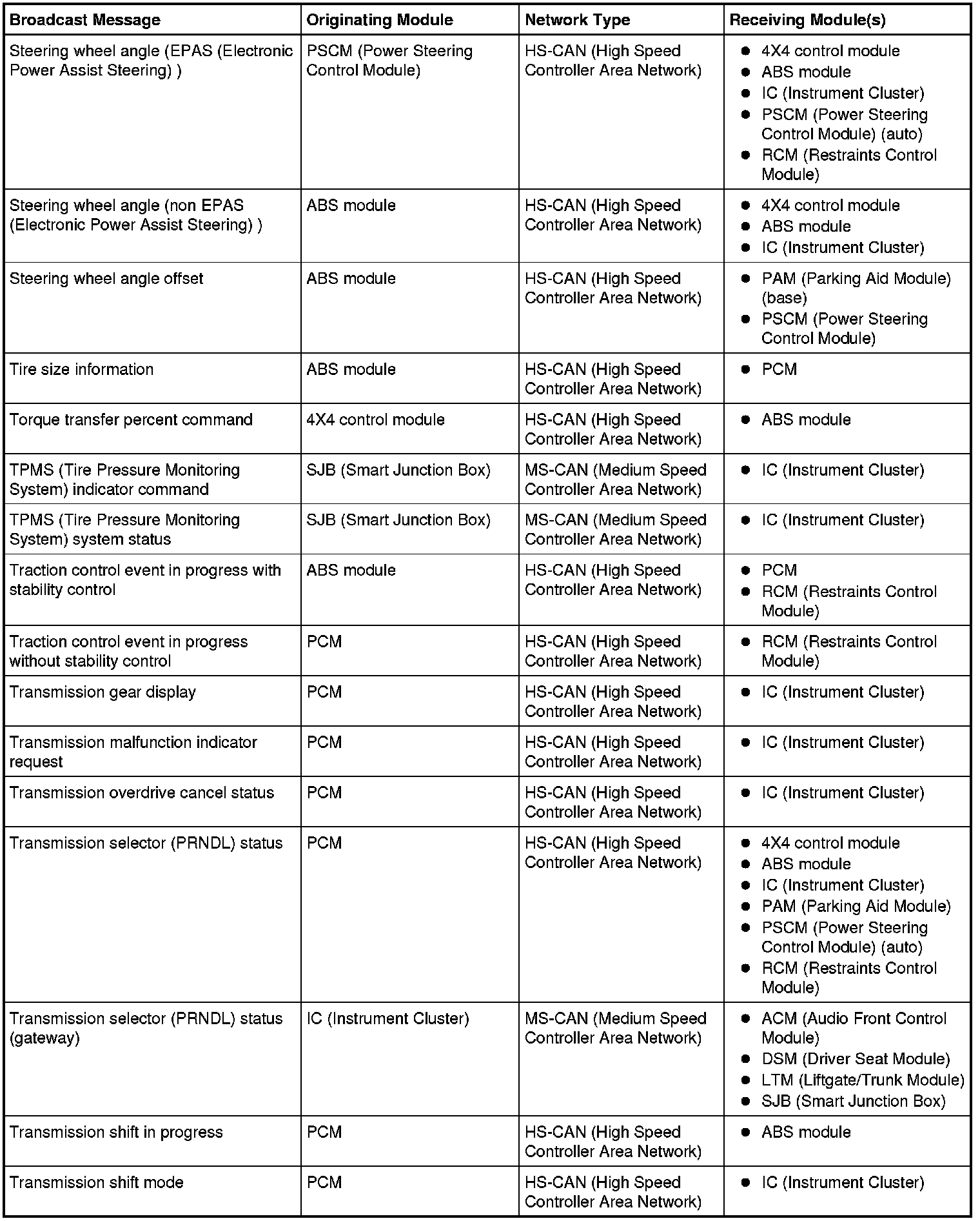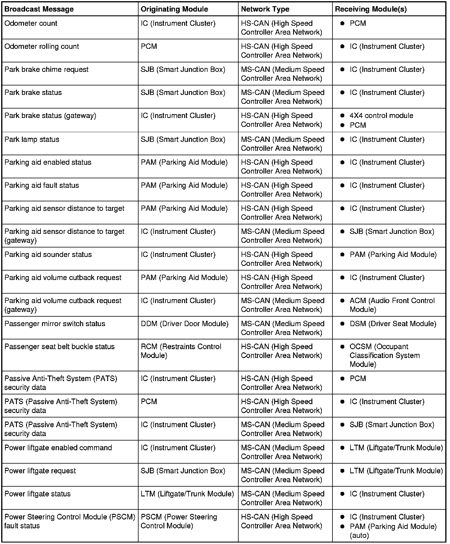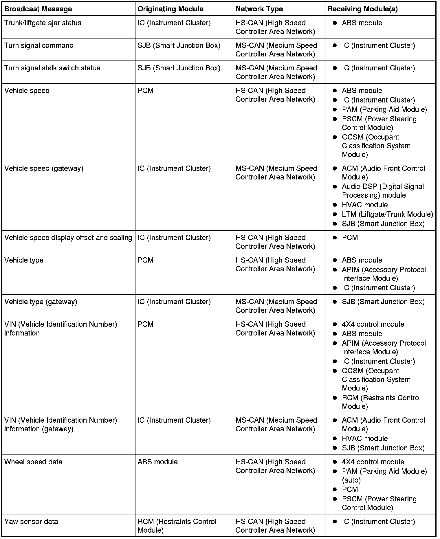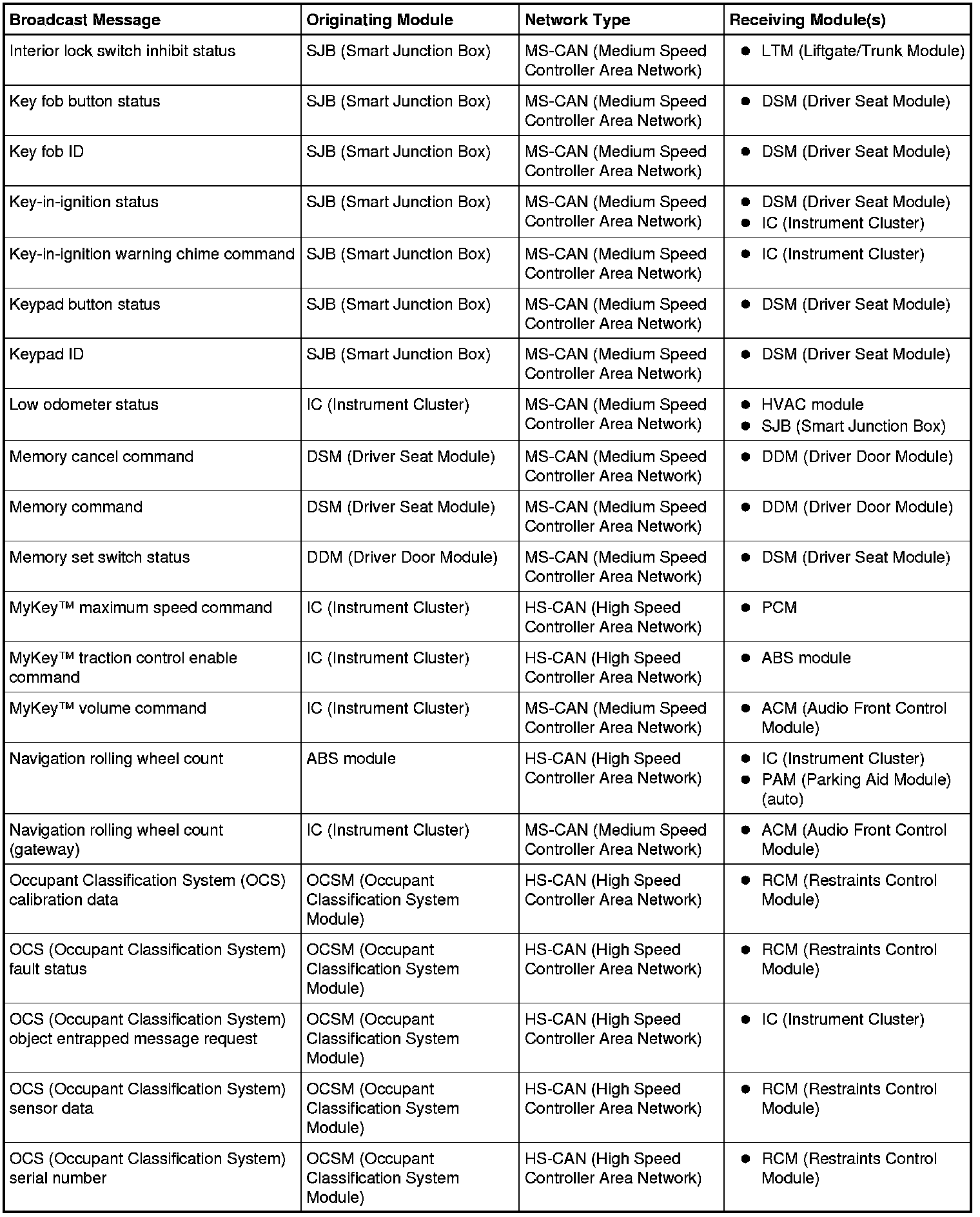 NOTE: This chart describes the specific HS-CAN (High Speed Controller Area Network) and MS-CAN (Medium Speed Controller Area Network) messages broadcast by each module, and the module(s) that receive the message.