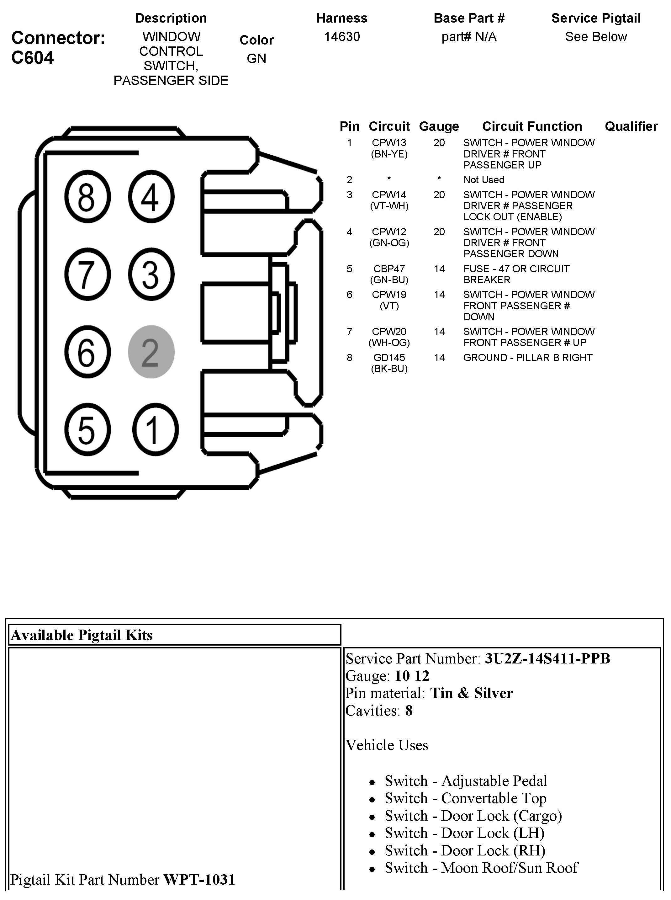 C604 Window Control Switch, Passenger Side