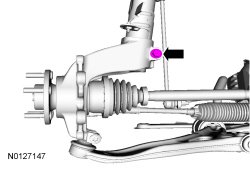 9. To make a positive camber adjustment, pull the strut outboard and loosen the wheel knuckle-to-strut bolt with the vehicle supported by the subframe. This allows the strut to sit on the wheel knuckle-to-strut bolt.
