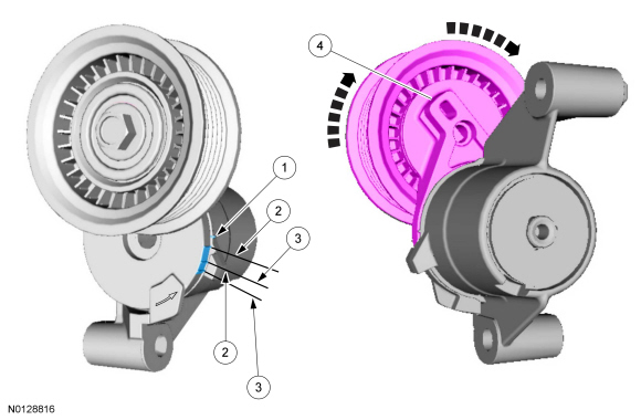 - Visually check the accessory drive belt tensioner for damage and wear, especially the mounting pad surface and arm alignment. If the accessory drive belt tensioner is not installed correctly, the mounting surface pad will be out of position. If the tensioner arm is worn, the arm will be out of alignment. Either of these conditions will result in chirp and squeal noises.