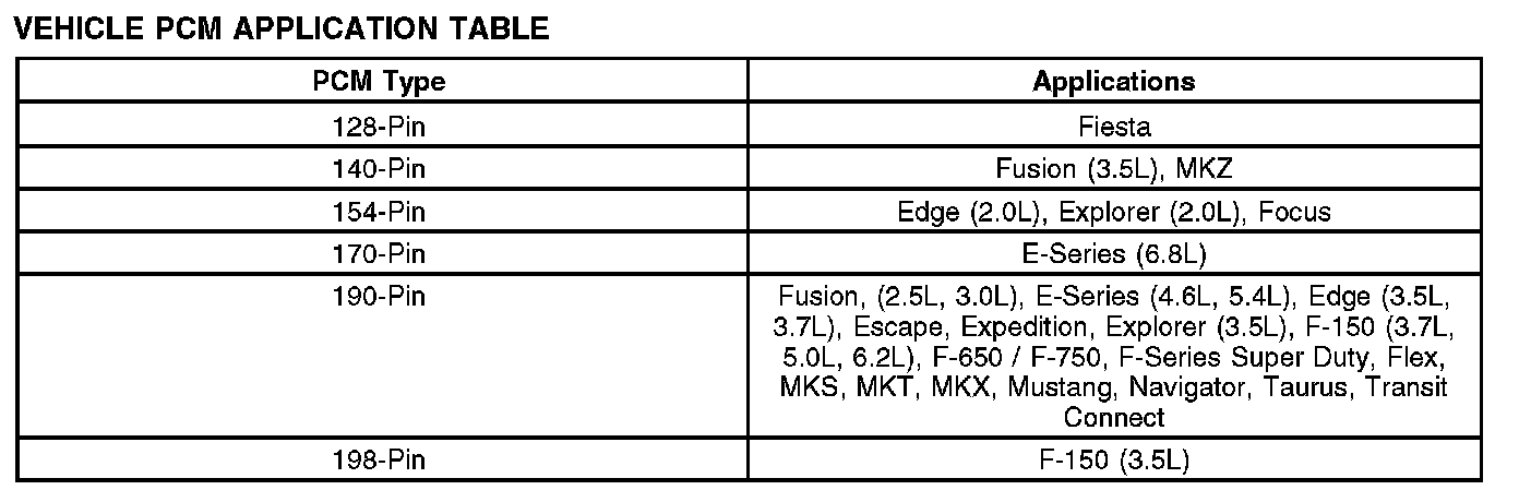 The center of the engine control (EC) system is a microprocessor called the PCM. The PCM receives input from sensors and other electronic components (switches, relays). Based on the information received and programmed into its memory, the PCM generates output signals to control various relays, solenoids and actuators. There are several different types of PCMs in use for this model year. Refer to the Vehicle PCM Application Table below for PCM types and their applications.