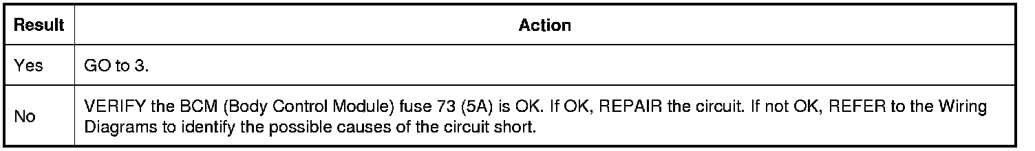 Verify BCM (Body Control Module) fuse 73 (5A) is OK.