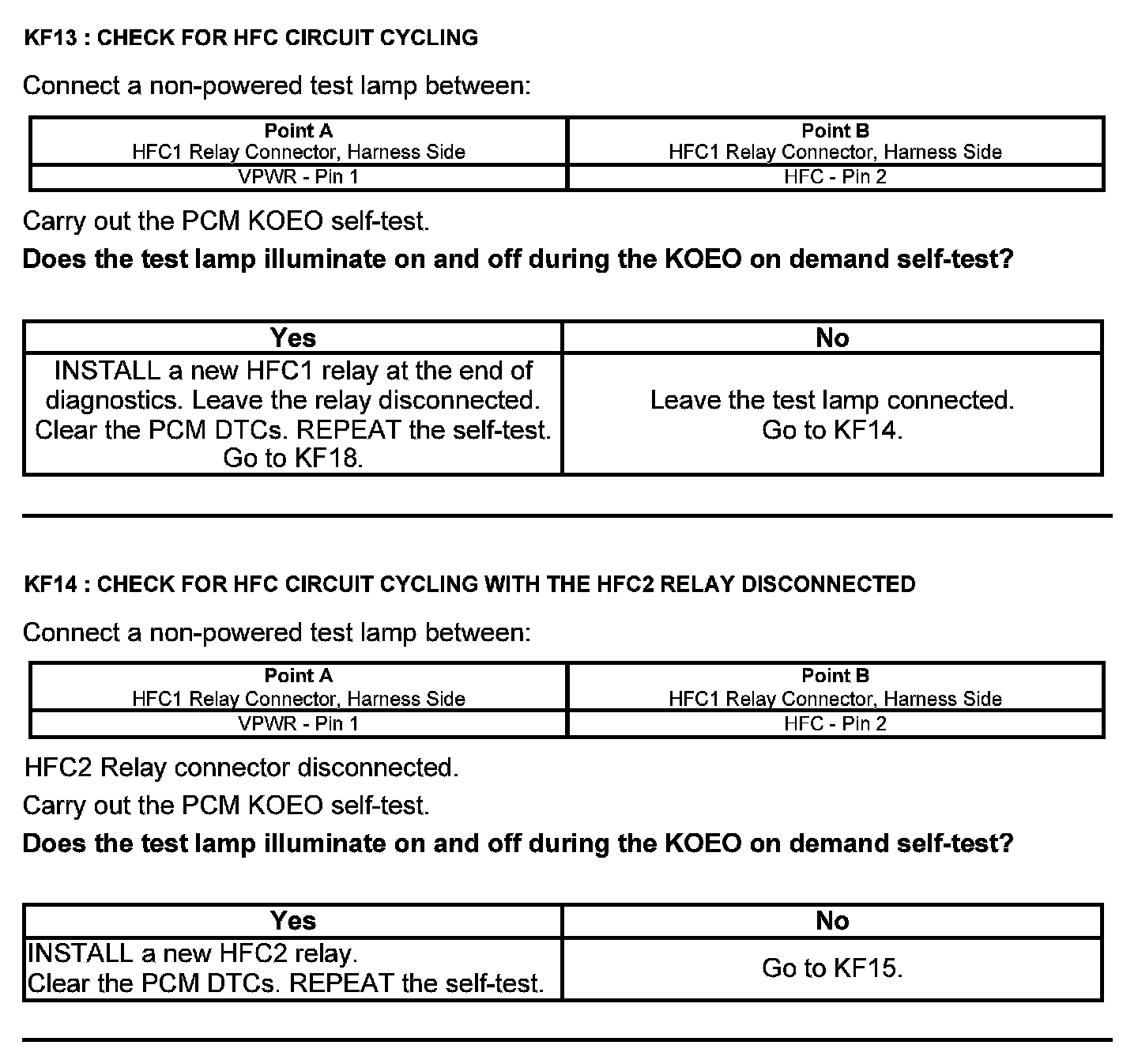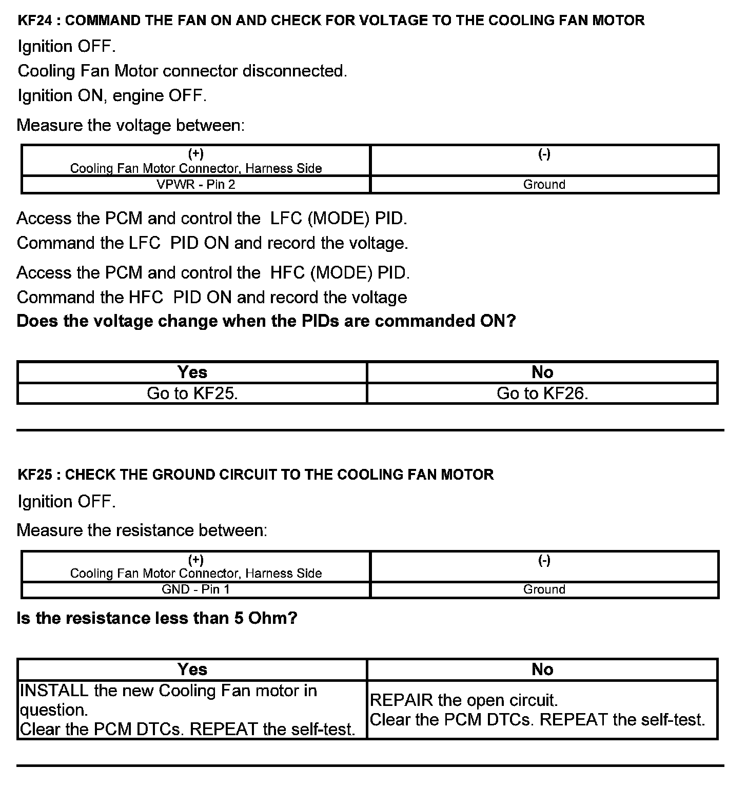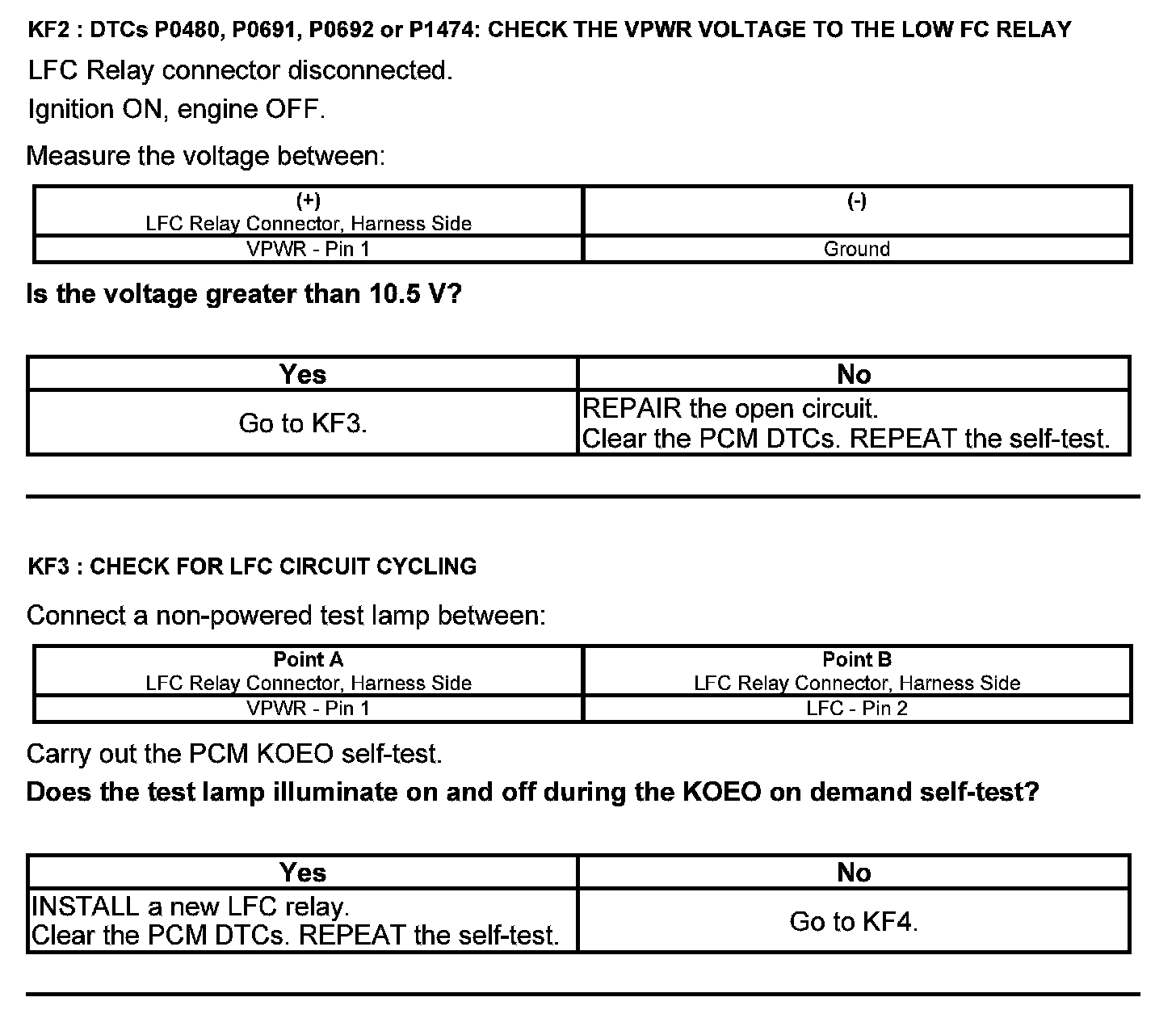 Home >> Ford >> 2012 >> Focus L4-2.0L >> Repair and Diagnosis >> Powertrain Management >> Computers and Control Systems >> Testing and Inspection >> Pinpoint Tests >> Test KF: Fan Control Relays