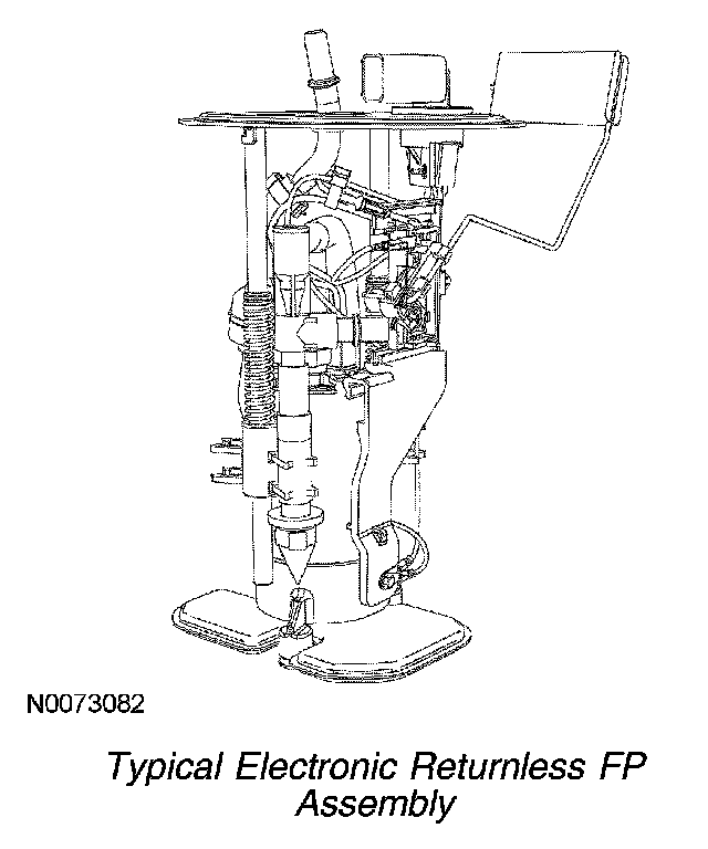 The FP assembly is mounted inside the fuel tank in a reservoir. The pump has a discharge check valve that maintains the system pressure after the ignition has been turned OFF to minimize starting concerns. The reservoir prevents fuel flow interruptions during extreme vehicle maneuvers with low tank fill levels.