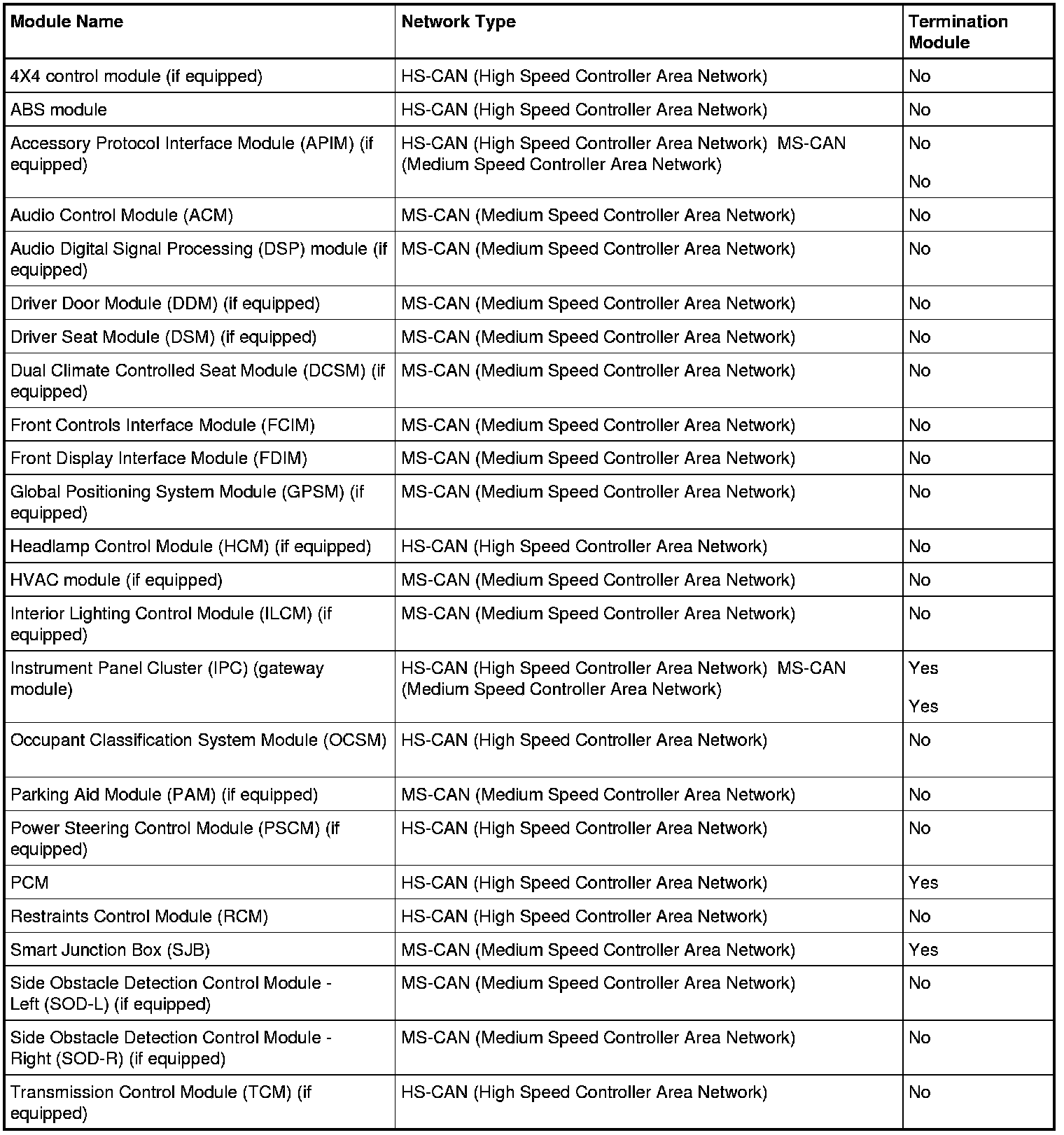 The IPC (Instrument Panel Cluster) is the gateway module, translating messages on the HS-CAN (High Speed Controller Area Network) to MS-CAN (Medium Speed Controller Area Network) and vice versa. This allows a message to be distributed throughout both networks. The IPC (Instrument Panel Cluster) is the only module on this vehicle that has this ability.