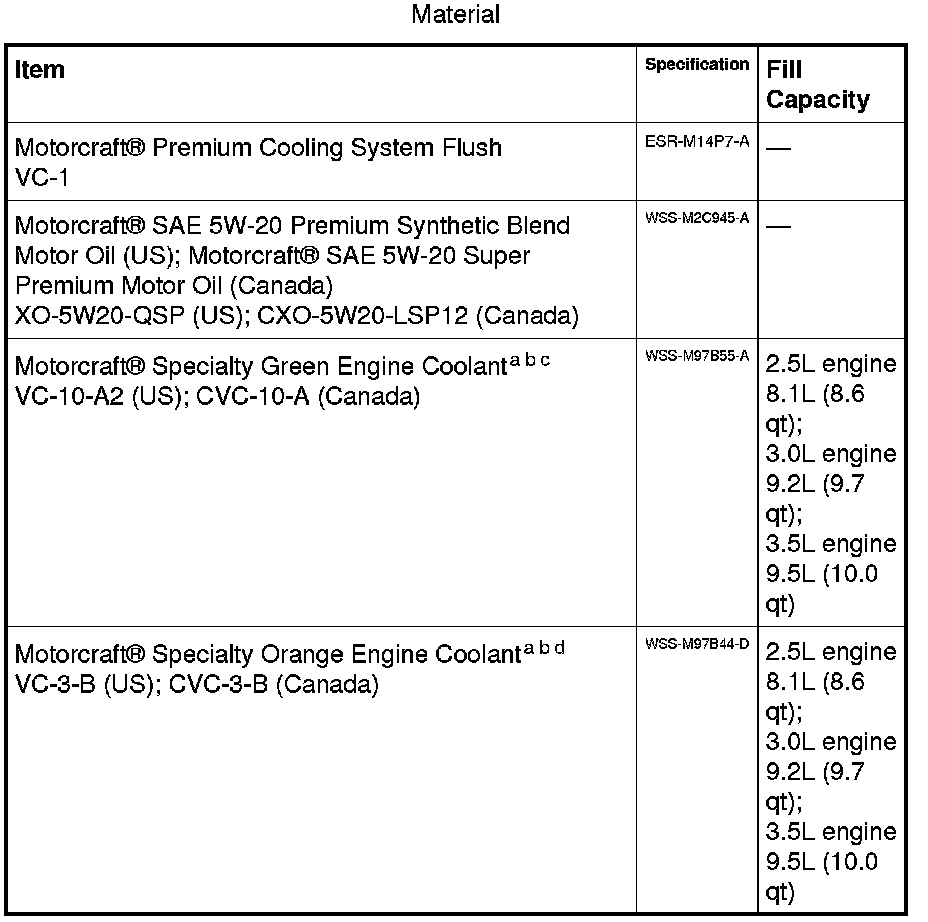 a The cooling system is filled with Motorcraft(R) Specialty Green Engine Coolant or Motorcraft(R) Specialty Orange Engine Coolant. Always fill the cooling system with the manufacturer's specified coolant. Chemically flush the cooling system if a non-specified coolant has been used.