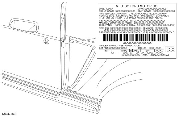The upper portion of the Vehicle Certification (VC) label contains the manufacturer name, the month and year of manufacture, the certification statement and the Vehicle Identification Number (VIN). It also includes Gross Vehicle Weight Rating (GVWR). The VC (Vehicle Certification) label is located on the LH door jamb.