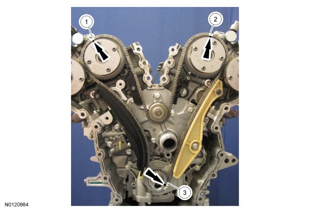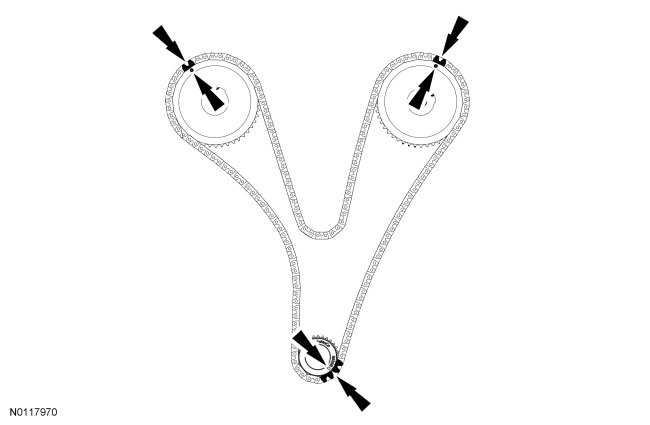 Install the primary timing chain with the colored links aligned with the timing marks on the VCT assemblies and the crankshaft sprocket.