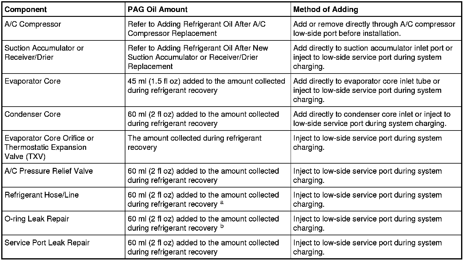 b: The amount specified may be used for one or multiple O-ring leak repairs. Do not multiply the PAG oil amount by the number of O-ring leaks being repaired.