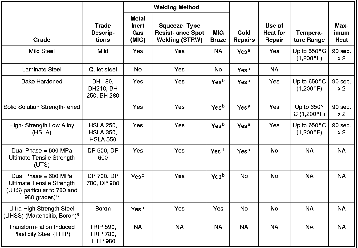 c Dual phase steels DP 700, DP 780 and DP 980 must be replaced at factory joints, no sectioning unless approved procedure in information