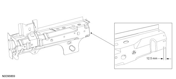 12. Measure 12.5 mm (0.49 in) forward from the lower rail cutline. Drill nine 8 mm (0.31 in) holes in the new lower side member for attachment of the insert.