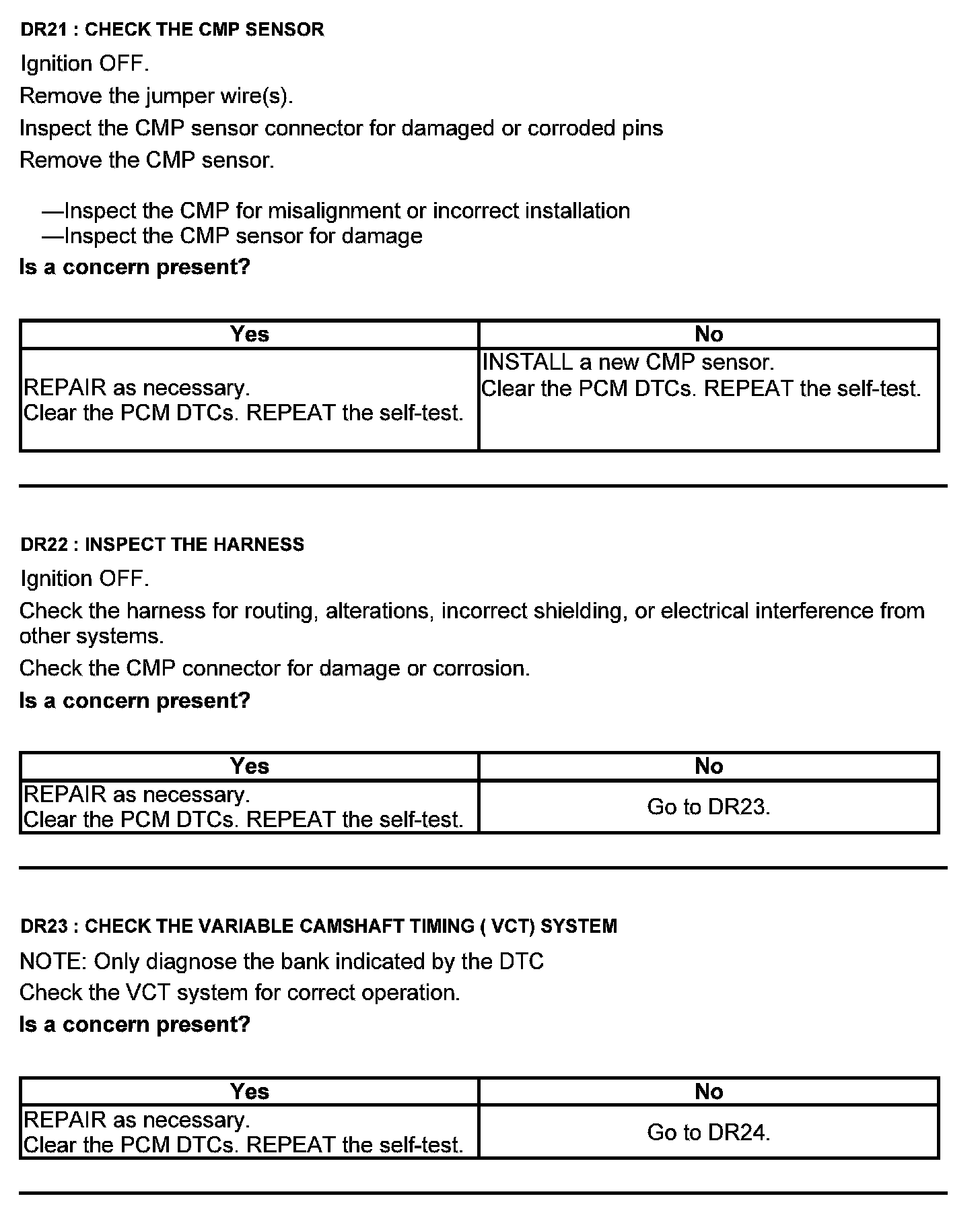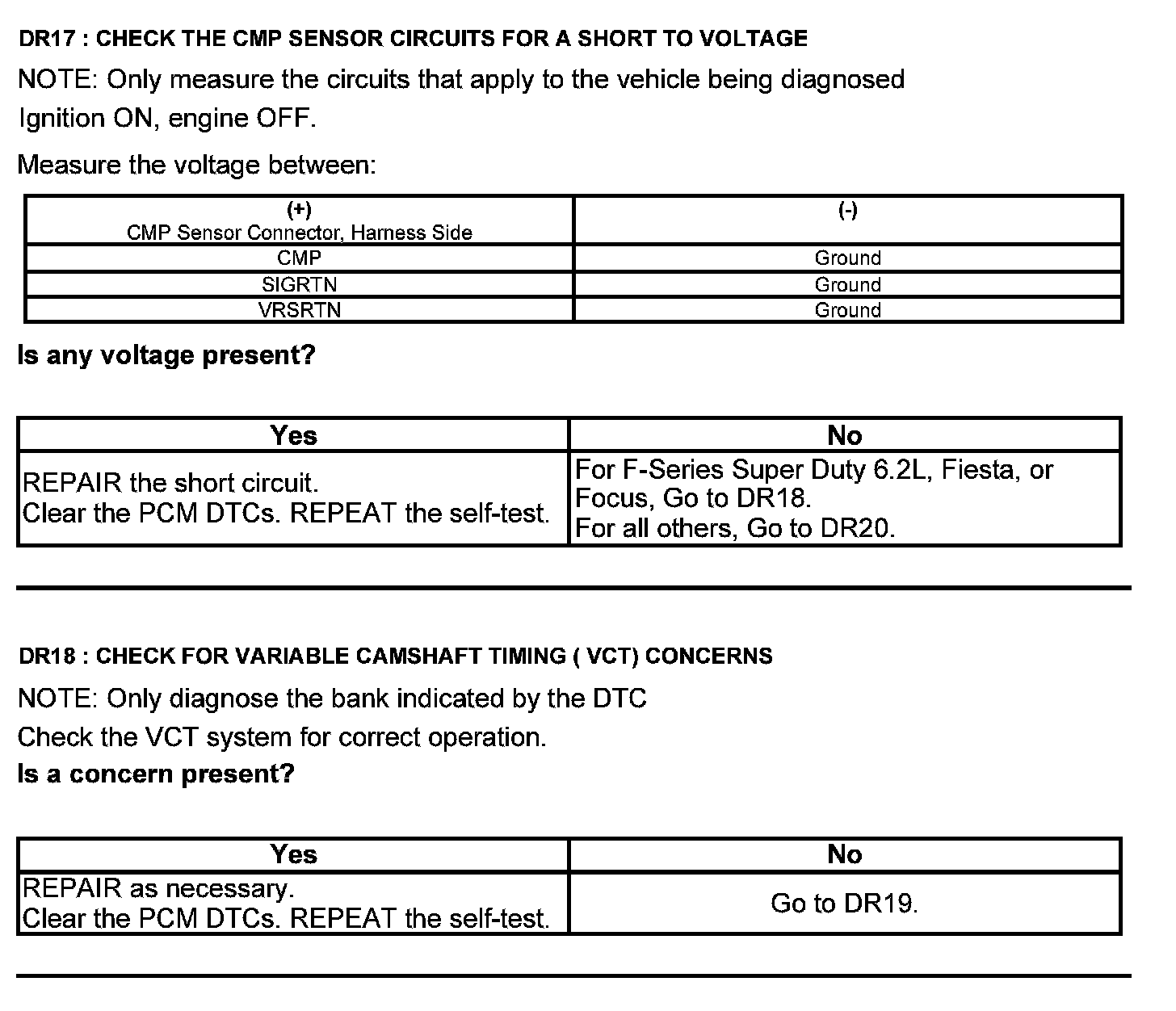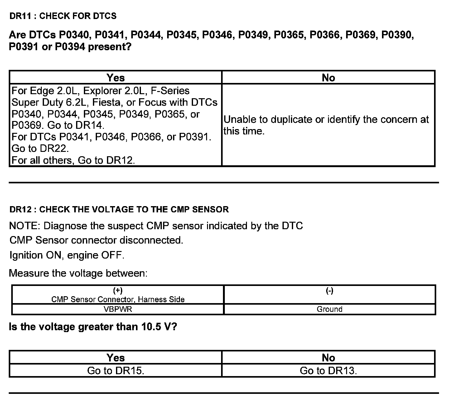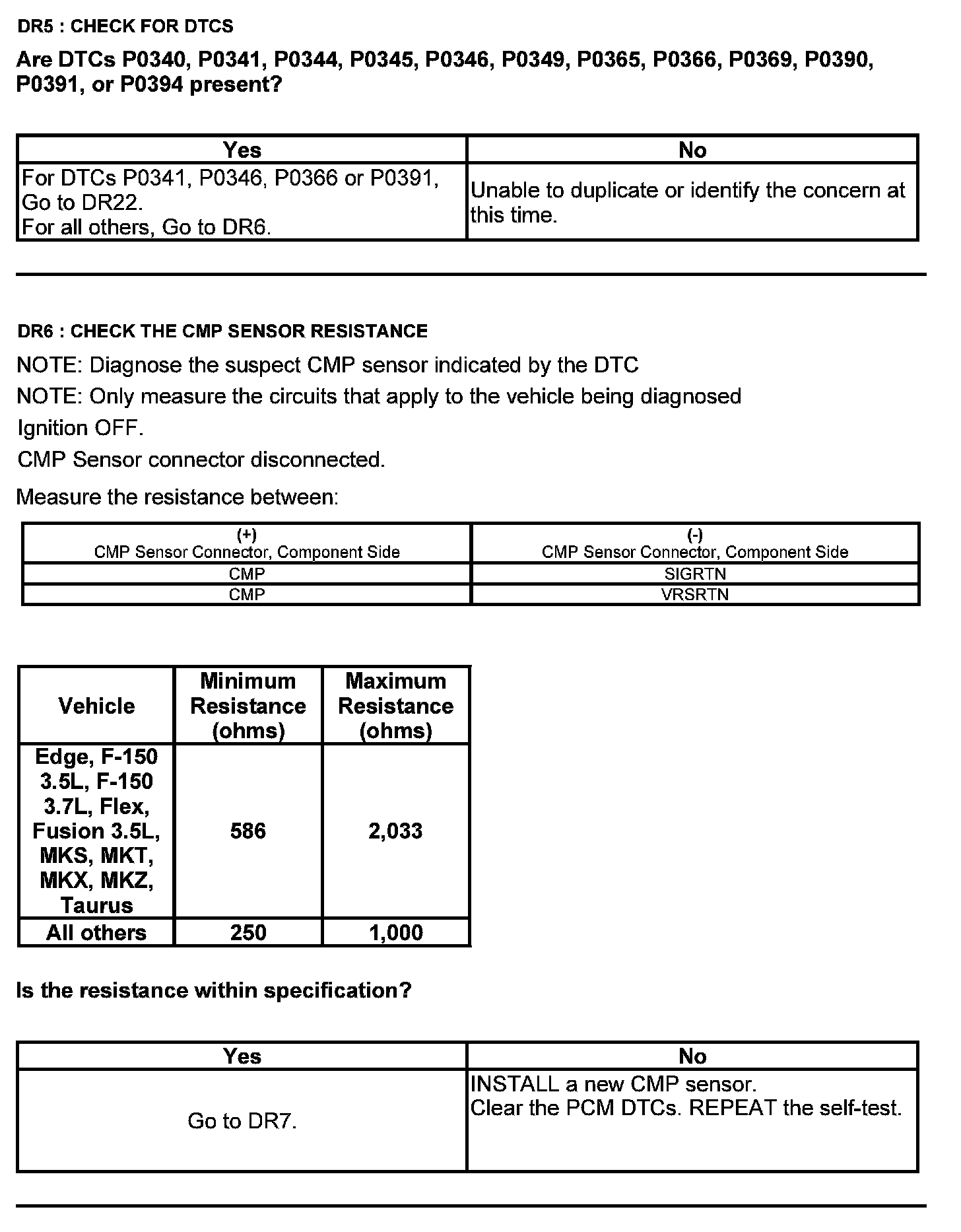 Home >> Ford >> 2012 >> Taurus AWD V6-3.5L >> Repair and Diagnosis >> Powertrain Management >> Computers and Control Systems >> Testing and Inspection >> Pinpoint Tests >> Test DR: Camshaft Position (CMP) Sensor