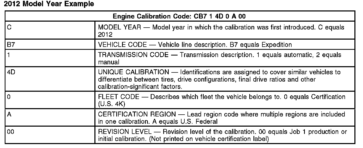 Base engine calibration information, sometimes referred to as the powertrain calibration, is located in the lower right corner of the vehicle certification label. Engine calibration information is limited to a maximum of 5 characters per line (2 lines maximum). Calibration information more than 5 characters long wraps to the second line of this field. Only the base calibration appears on this label. The revision level is no longer printed on the label. However, it can be found in the On-Line Automotive Service Information System (OASIS). For additional information on the vehicle certification label or engine calibration, refer to the Vehicle Identification Codes.