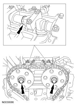 Using the flats on the camshafts to prevent camshaft rotation, tighten the camshaft drive gear bolts to 72 Nm (53 lb-ft).