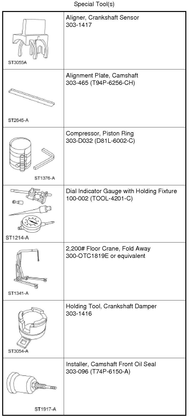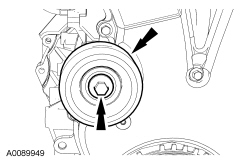 NOTICE: Do not loosen or remove the crankshaft pulley bolt without first installing the special tools as instructed. The crankshaft pulley and the crankshaft timing sprocket are not keyed to the crankshaft. The crankshaft, the crankshaft sprocket and the pulley are fitted together by friction, using diamond washers between the flange faces on each part. For that reason, the crankshaft sprocket is also unfastened if the pulley bolt is loosened. Before any repair requiring loosening or removal of the crankshaft pulley bolt, the crankshaft and camshafts must be locked in place by the special service tools, otherwise severe engine damage can occur.