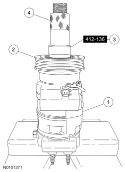 5. NOTE: The A/C compressor must be positioned on the press so that only the flat part of the A/C compressor housing is contacting the base with the A/C compressor shaft aligned with the center of the press shaft. If the A/C compressor is not installed correctly on the press, the A/C compressor and/or A/C compressor pulley will be damaged.