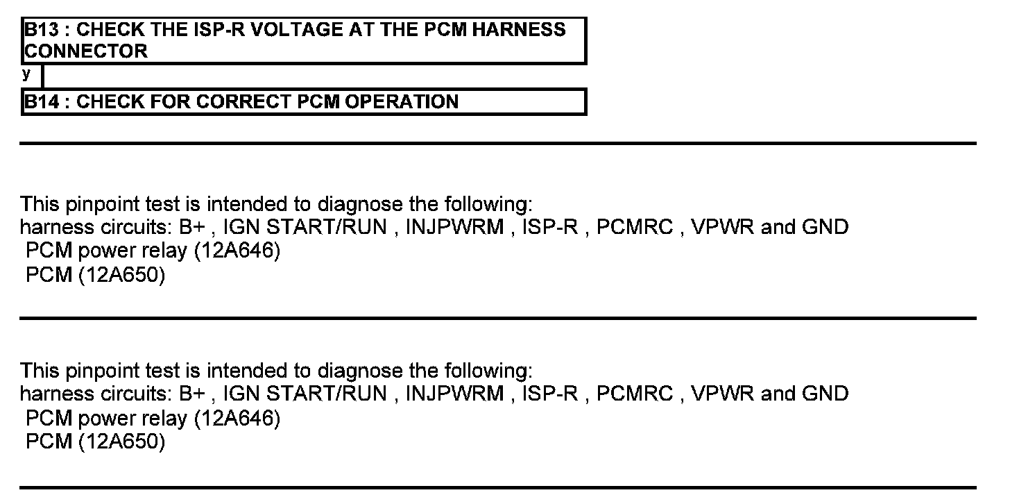 Home >> Ford >> 2012 >> Transit Connect L4-2.0L >> Repair and Diagnosis >> Powertrain Management >> Computers and Control Systems >> Testing and Inspection >> Pinpoint Tests >> Test B: Powertrain Control Module (PCM) Power Relay