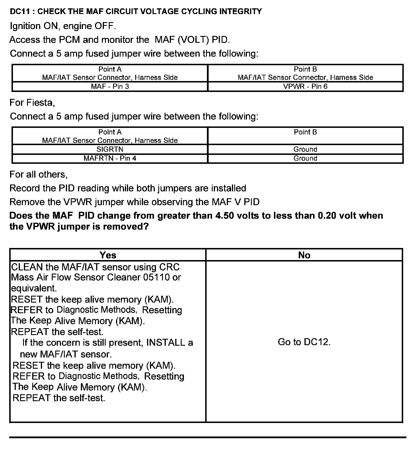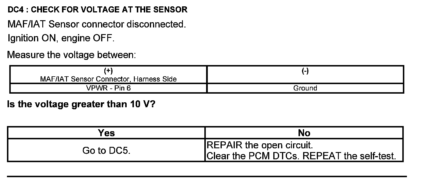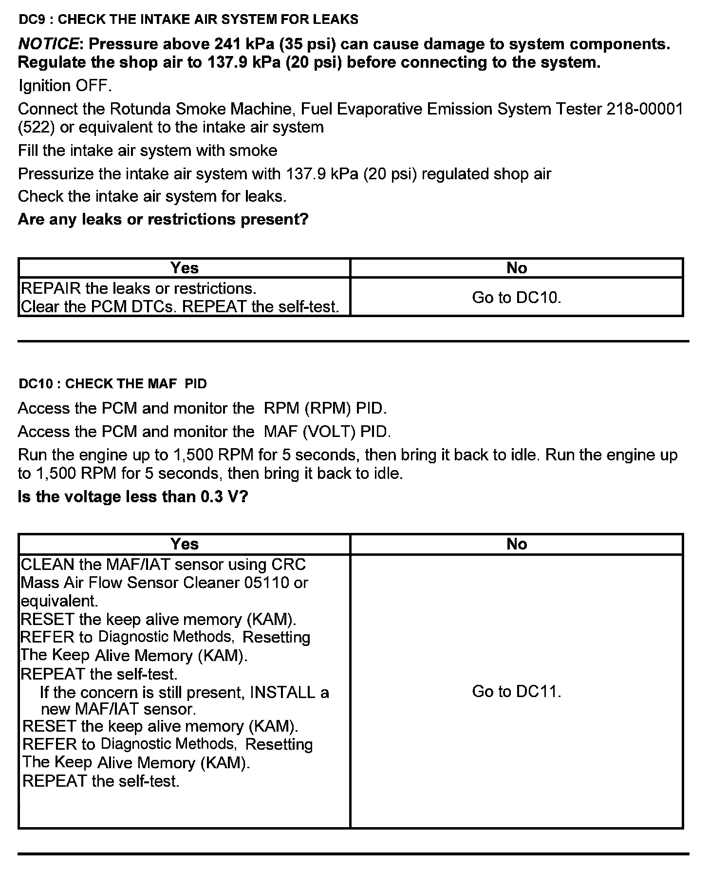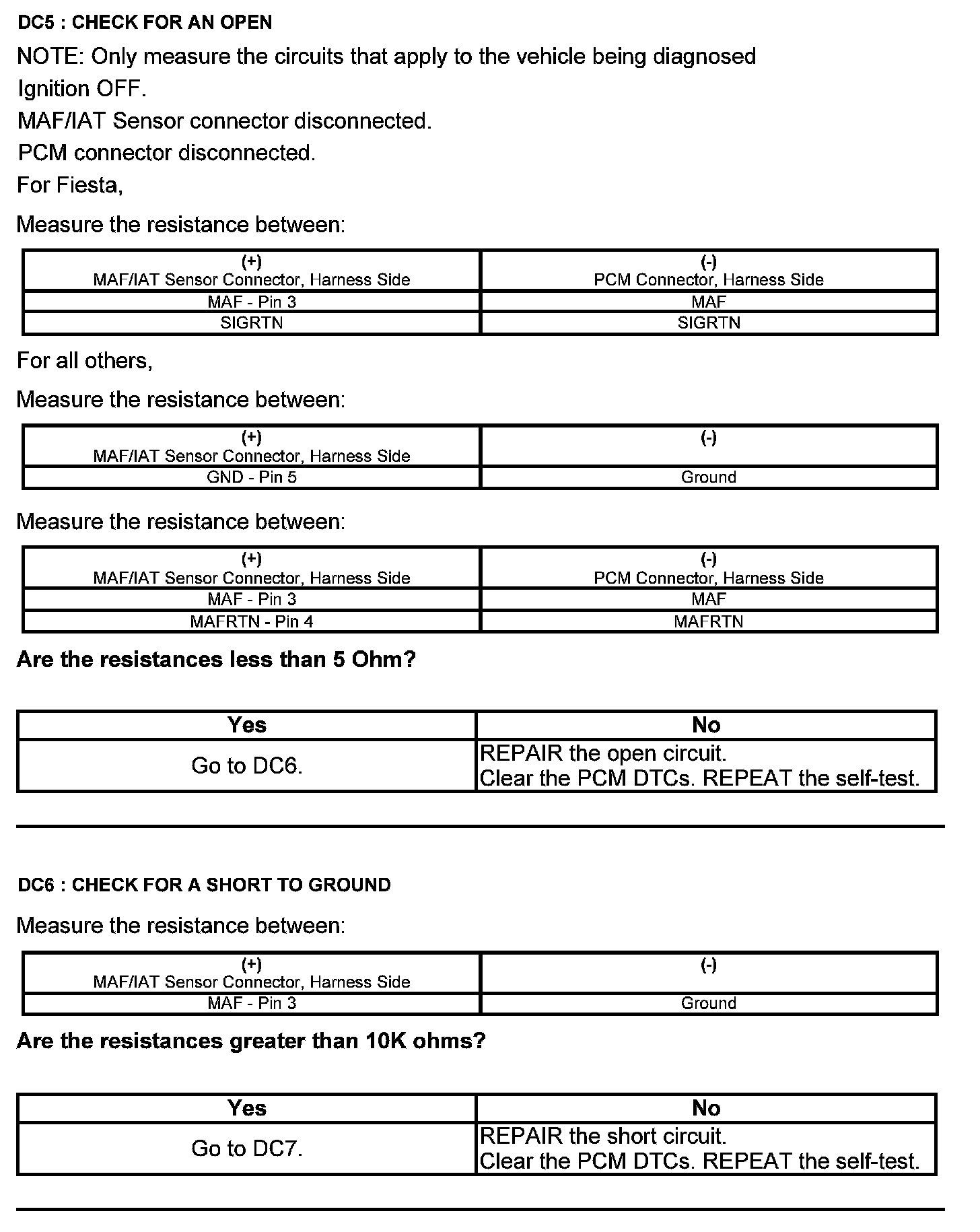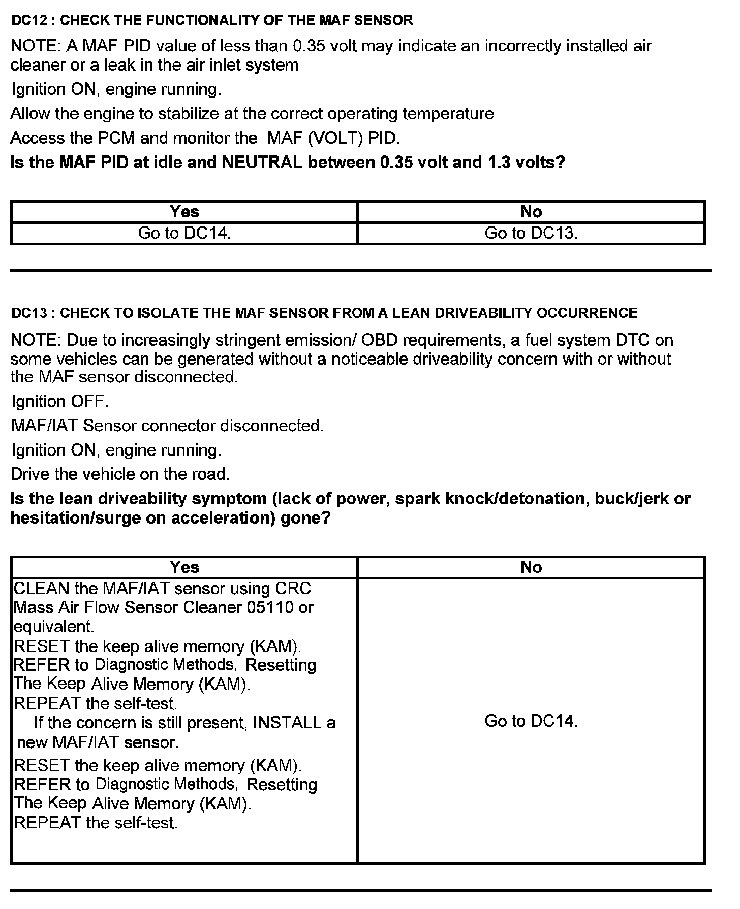 Home >> Ford >> 2012 >> Transit Connect L4-2.0L >> Repair and Diagnosis >> Powertrain Management >> Computers and Control Systems >> Testing and Inspection >> Pinpoint Tests >> Test DC: Mass Airflow (MAF) Sensor