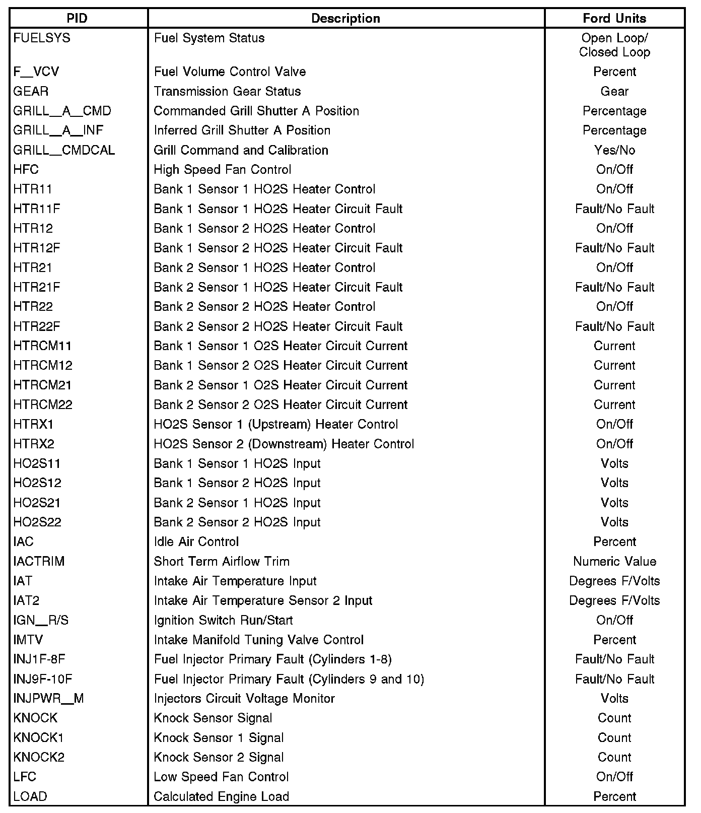 The PID mode allows access to powertrain control module (PCM) information. This includes analog and digital signal inputs and outputs along with calculated values and the system status. There are two types of PID lists available and both are used throughout. The first is the generic (J1979) OBD PID list. This is a standard set of PIDs that all scan tools must be able to access. The second is a Ford specific (J2190) list which can be accessed by an appropriate scan tool. When accessing any of these PIDs, the values are continuously updated. The generic or Ford PID list provides definitions and values in appropriate units.