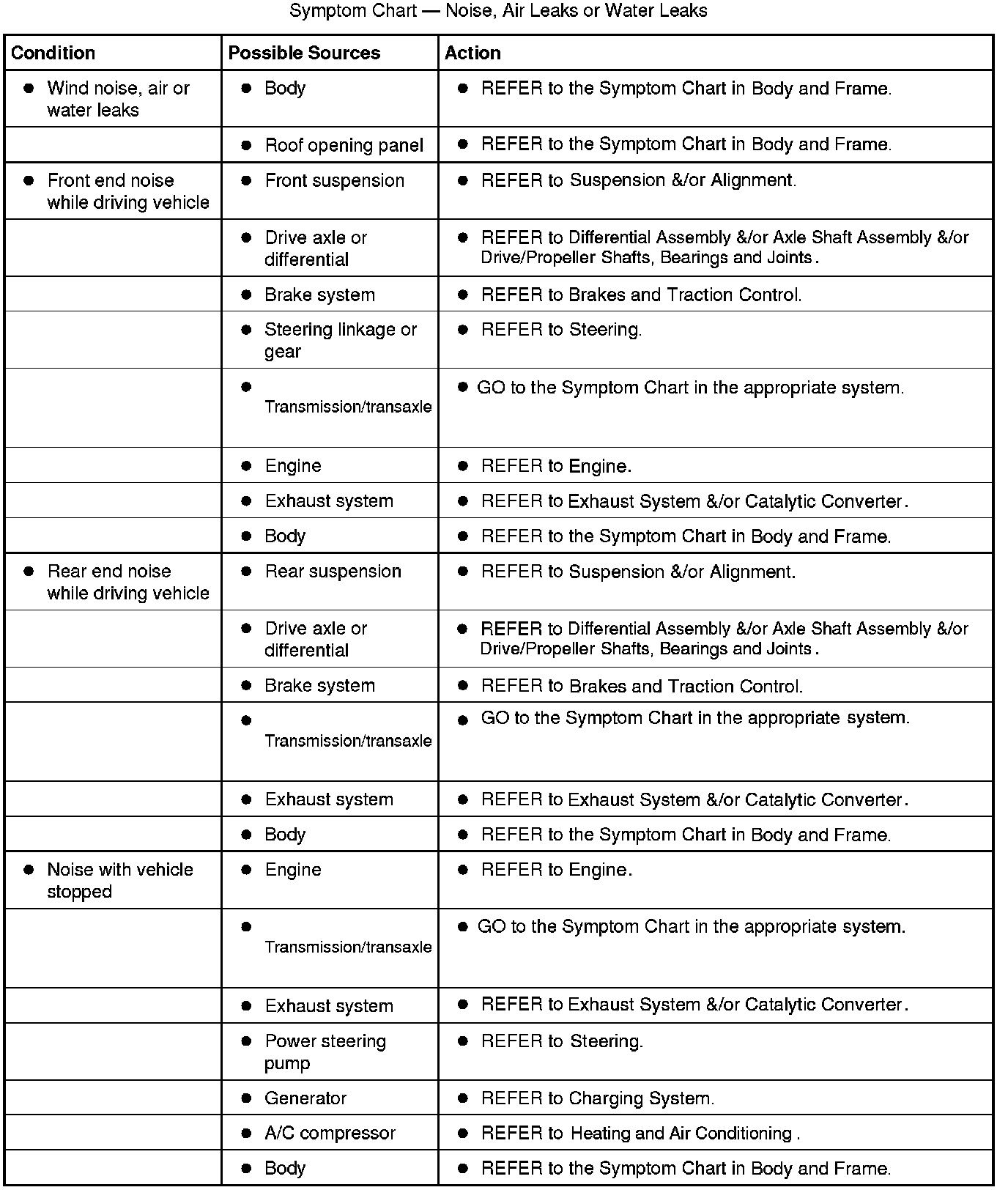 Symptom Chart - Noise, Air Leaks or Water Leaks