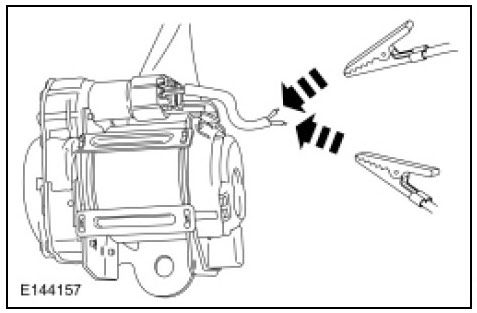64. Deploy the safety belt anchor, buckle or retractor by touching the ends of the 2 wires of the jumper harness to the terminals of a 12-volt battery.