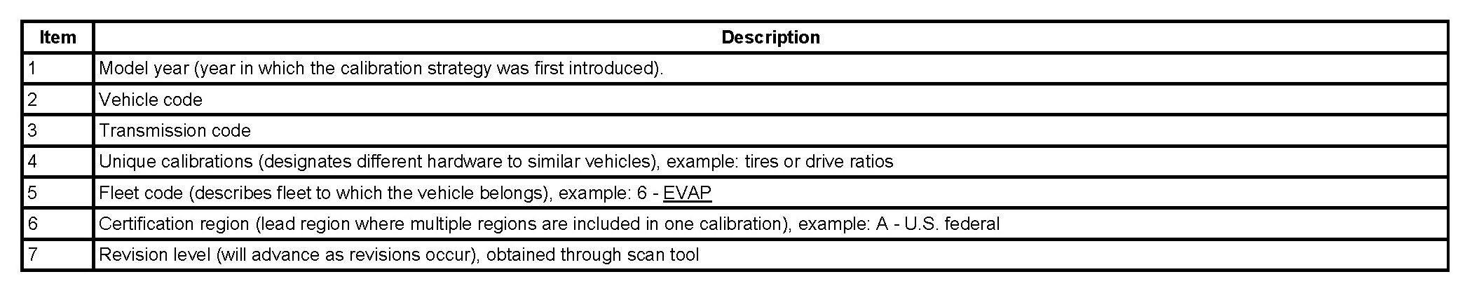 The Emission/Corporate Average Fuel Economy/CO2 Compliance Department is responsible for assigning these calibration numbers. Unique identifications are assigned to cover similar vehicles to differentiate between tires, drive configurations, final drive ratios and other calibration-significant factors. These 2 characters are chosen by the analyst to provide identifiable information unique to each calibration. For example, using the number 2 to denote a 2- valve engine versus using the number 4 to denote a 4-valve engine provides an easily identifiable difference.