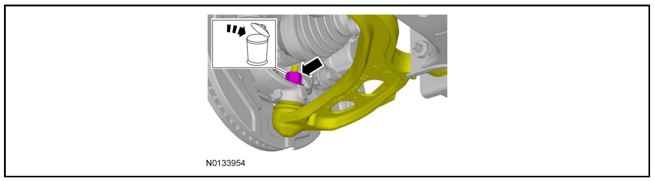 11. NOTICE: Use care when releasing the lower arm and knuckle into the resting position or damage to the ball joint seal or CV boot may occur.