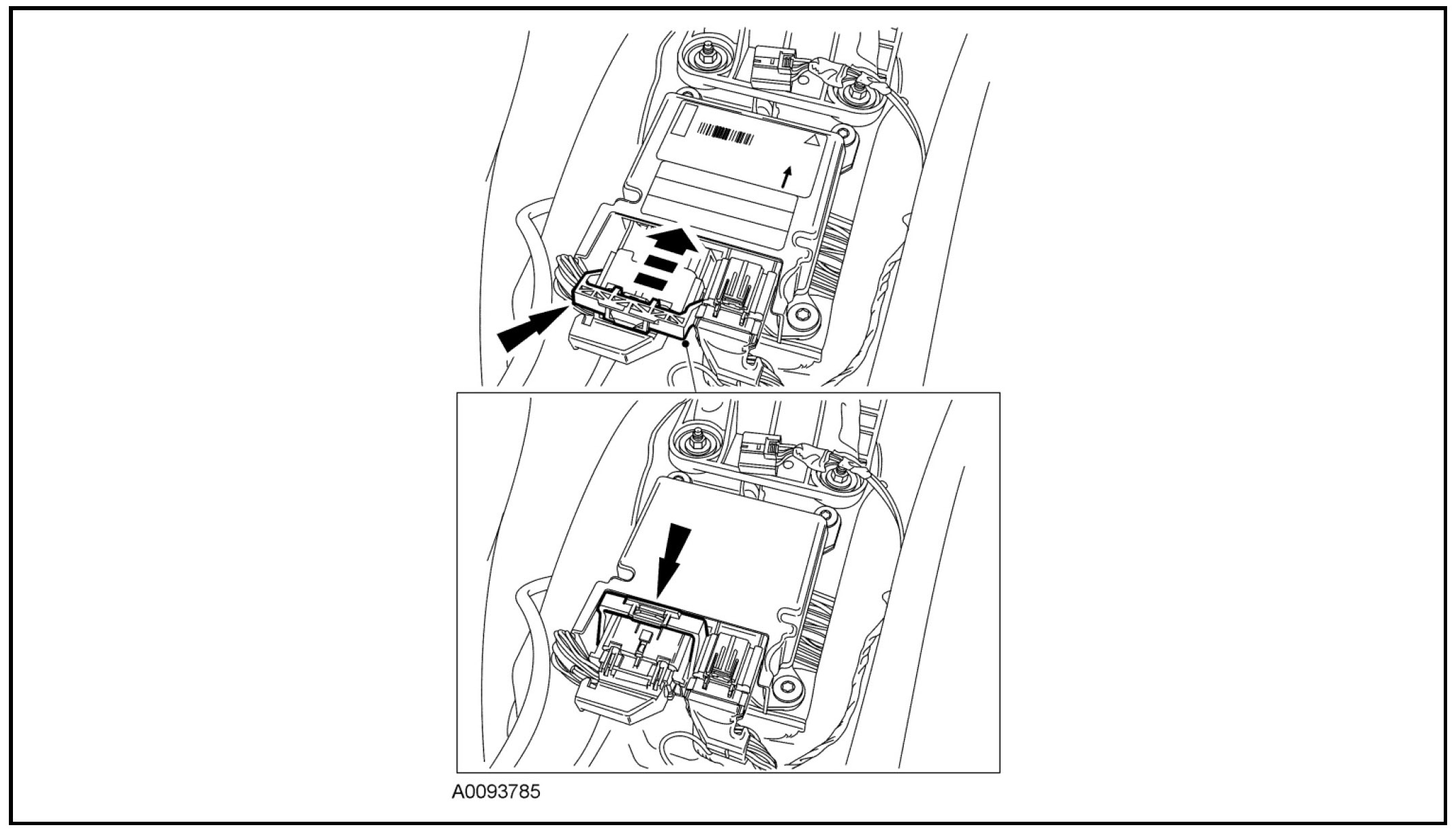 - NOTICE: Do not push the connector to where the lever pivots and seats itself. Light pressure is needed to get the connector into position on the Restraints Control Module (RCM) before using the lever to fully seat the connector.