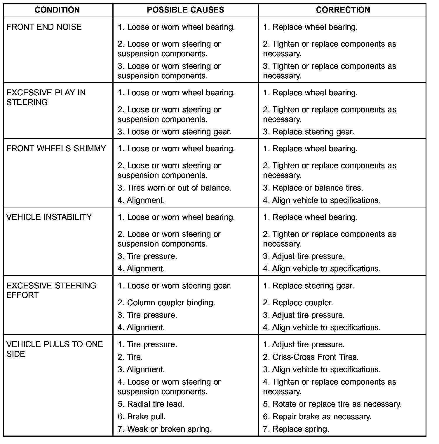 Before starting wheel alignment, the following inspection and necessary corrections must be completed. Refer to Suspension and Steering System Diagnosis Chart below for additional information.