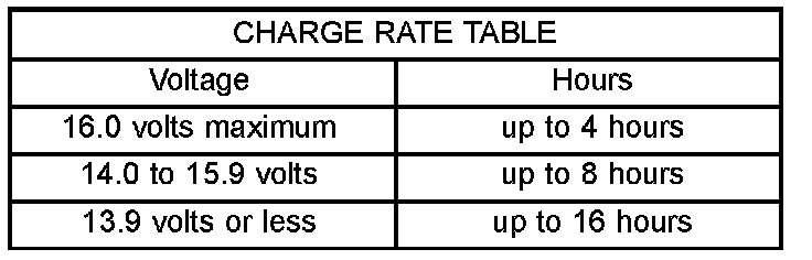 3. Battery chargers vary in the amount of voltage and current they provide. The amount of time required for a battery to accept measurable charging current at various voltages is shown in the Charge Rate Table. If the charging current is still not measurable at the end of the charging time, the battery is faulty and must be replaced. If the charging current is measurable during the charging time, the battery may be good and the charging should be completed in the normal manner.