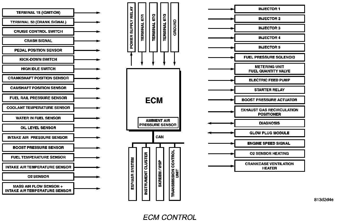 The electronic control module (ECM) is mounted to the left lower dash panel and consists of an electronic printed circuit board which is designed as a milliliter board assembly fitted on both sides. The routing of the wiring harness connector at the ECM connector are split into interfering cables and sensitive cables in order to achieve improved electromagnetic compatibility. The smaller wiring harness connector is used for the vehicle wiring harness and the larger harness is used for the engine wiring harness. The ECM stores engine specific data, monitors the connected sensor and analyzes their measurement.