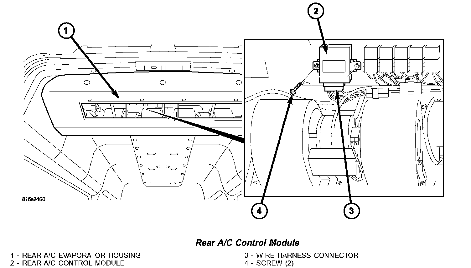 4. Remove the two screws that secure the rear A/C control module to the rear A/C evaporator housing and remove the control module.