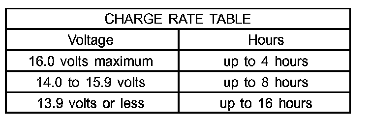 3. Battery chargers vary in the amount of voltage and current they provide. The amount of time required for a battery to accept measurable charging current at various voltages is shown in the Charge Rate Table. If the charging current is still not measurable at the end of the charging time, the battery is faulty and must be replaced. If the charging current is measurable during the charging time, the battery may be good and the charging should be completed in the normal manner.
