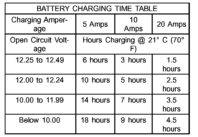 The Battery Charging Time Table gives an indication of the time required to charge a typical battery at room temperature based upon the battery state-of-charge and the charger capacity.