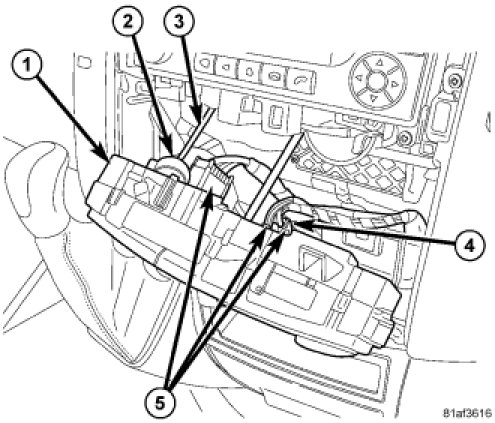 7. Disconnect the wire harness connectors (5) from the back of the A/C-heater control and remove the control from the vehicle.