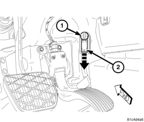 8. Retrieve the isolating connector (1) from under the accelerator pedal and position it onto the grounding stud.