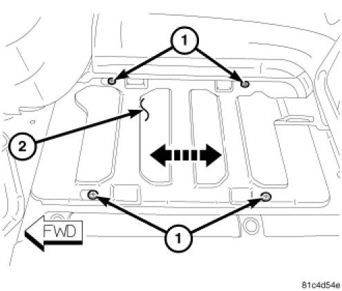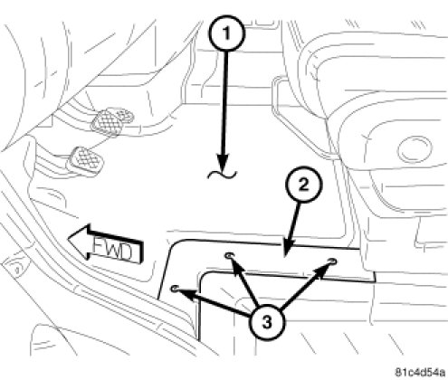 3. Position the battery access cover (2) onto the vehicle floor over the battery compartment and push the cover forward until the screw holes line up.
