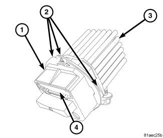 The blower motor power module consists of a molded plastic housing (1) with an integral wire connector receptacle (4). Concealed behind the housing is the power module electronic circuitry and heat sink (3). The blower motor power module also has integral mounting tabs (2) to secure it to the HVAC housing.