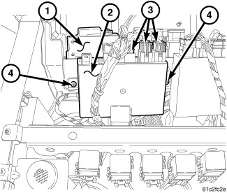 1. Position the Trailer Module (TM) (2) to the module mounting strip (1) within the driver side front seat riser.