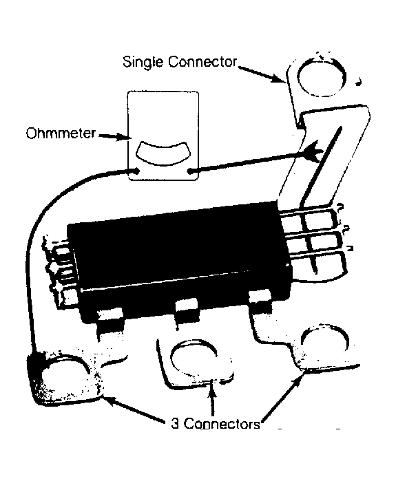 2. A good diode trio will give one high and one low reading. If both readings are the same, replace diode trio. Repeat tests between single connector and each of the 2 connectors.