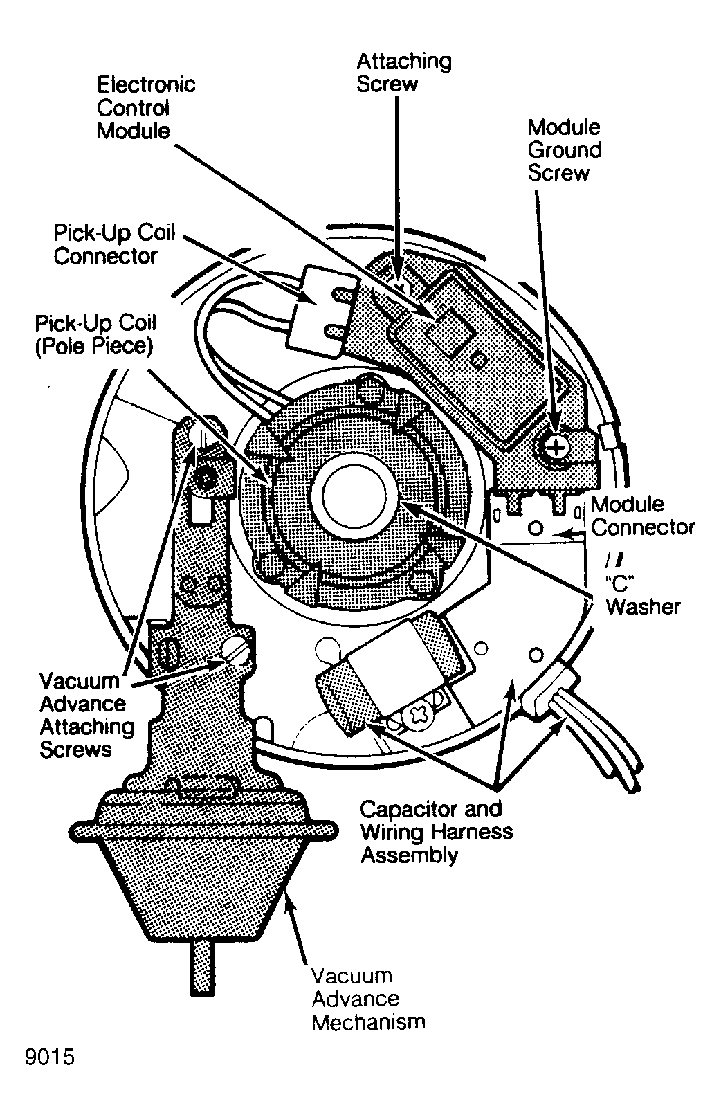 - Remove 2 attaching screws holding module to housing, and position module to disconnect pick-up coil and wiring harness connectors. Remove "C" washer from housing, and lift pick-up coil assembly from advance unit and distributor shaft.