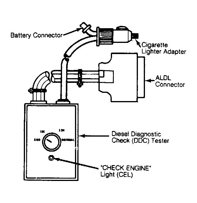 The ECM of the DEC system is equipped with a self-diagnostic system which detects system failures or abnormalities. However, the system does not store trouble codes or provide a visual display of malfunctions. To determine the cause of driveability problems, a Diesel Diagnostic Check (DDC) tester (J 34750 or equivalent) must be connected to the system. See Fig 1 .