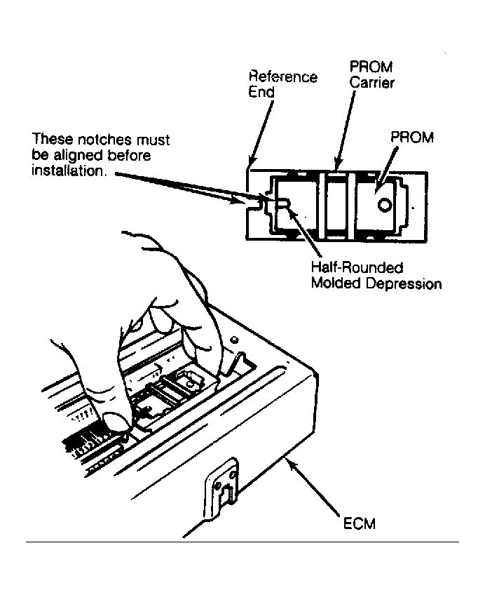 2. Grasp PROM carrier at narrow ends. Gently rock PROM from side to side while pulling up on PROM. Remove PROM from PROM carrier. Note the location of reference notches in the PROM and ECM for reassembly reference. See Fig 1 .