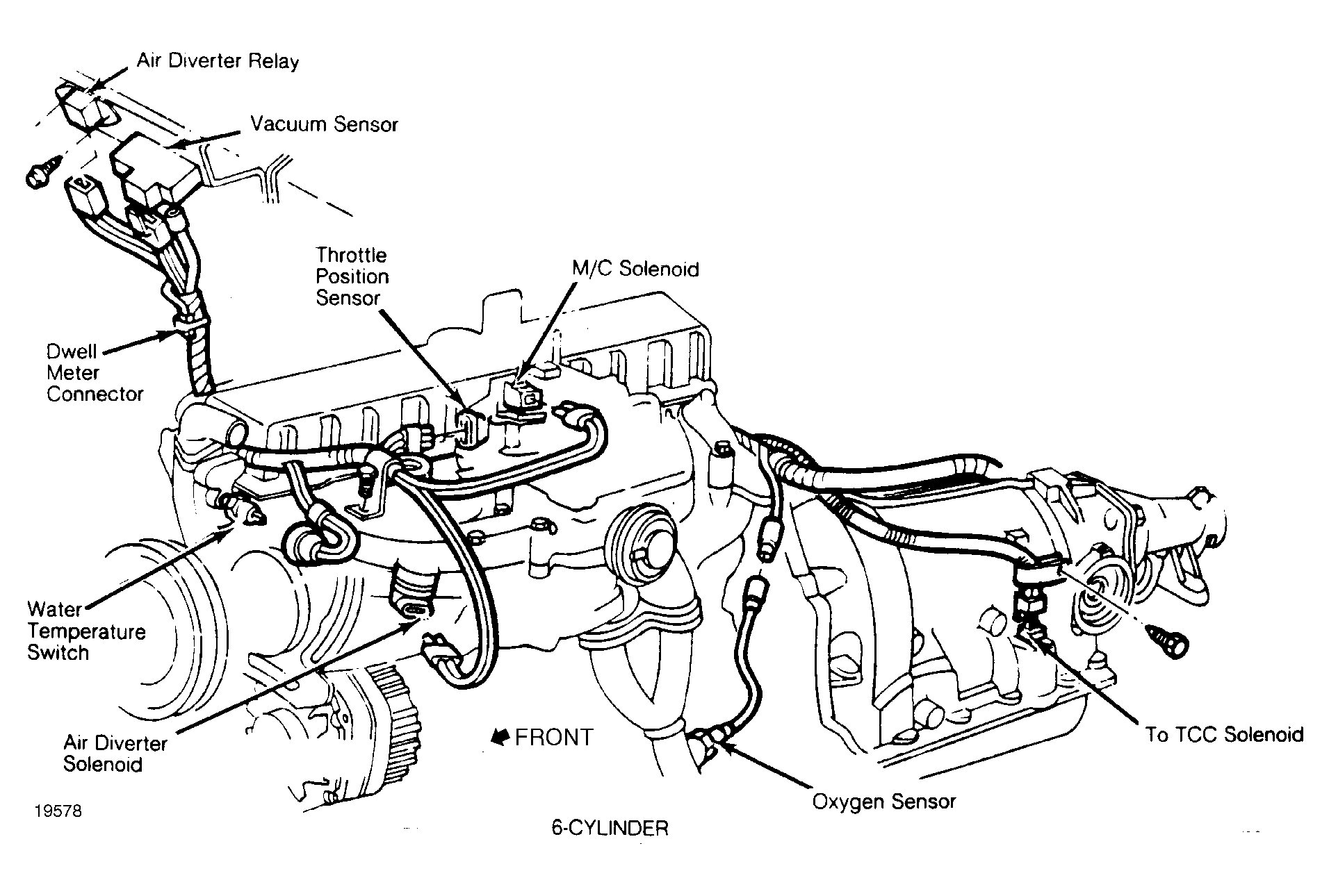 Oxygen Sensor (6-Cyl.) In front exhaust pipe. See Figure.